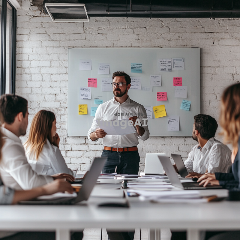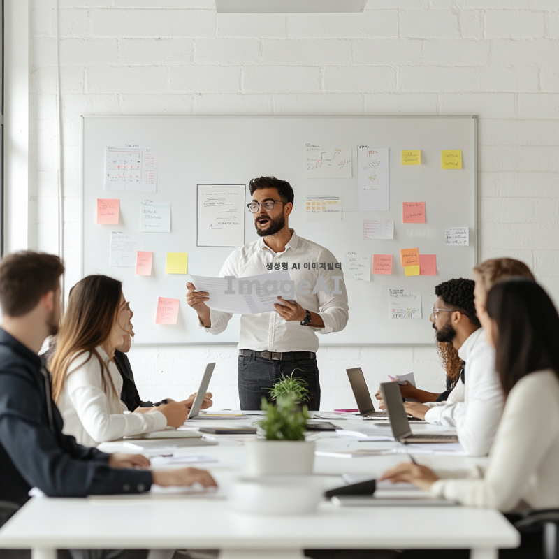 화이트톤의 깔끔하고 단순하며 정돈된 현대적인 회사 회의실 배경, 주변에 아크릴 보드에 무언가 잔뜩 적혀있음. 하얀색 회의 테이블을 가운데 두고 깔끔한 복장을 한 7명의 직장인들이 앉아있고, 한 남성이 테이블 앞에서 한 손에는 종이서류를 쥐고 열정적으로 설명하며 회의 중. 테이블에는 각자의 노트북과 마우스, 회의를 위한 서류가 올려져 있음. 밝고 명랑하며 창의적이고 혁신적인 분위기, 전문성과 열정을 나타내는 표정.