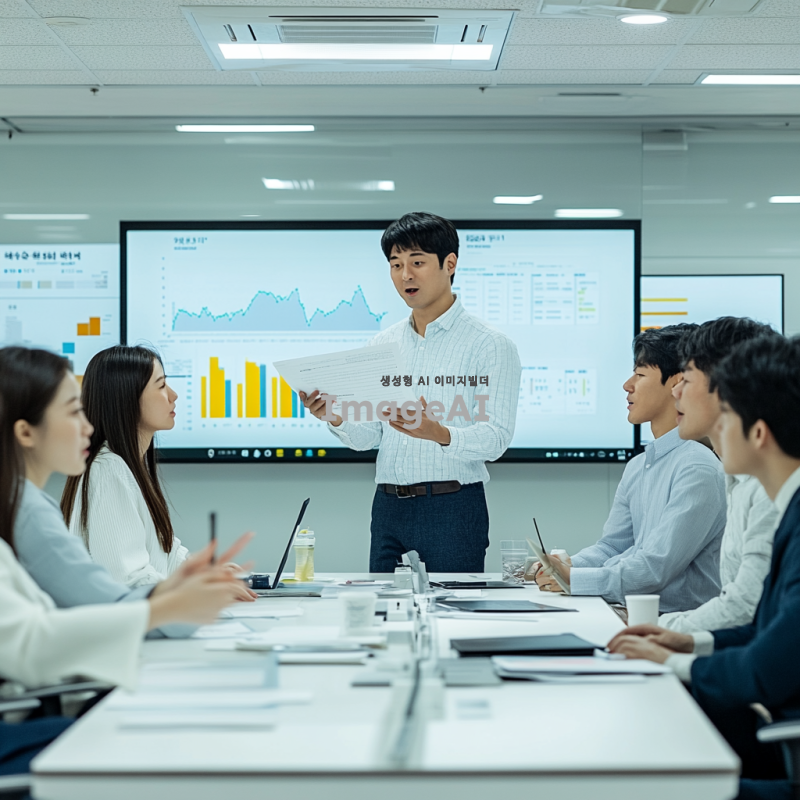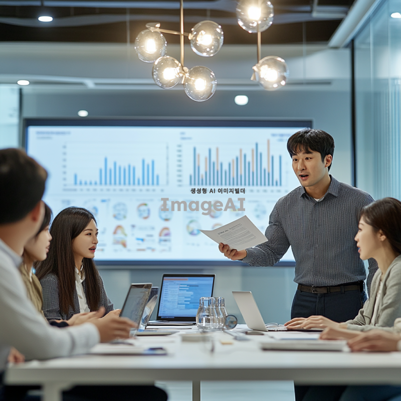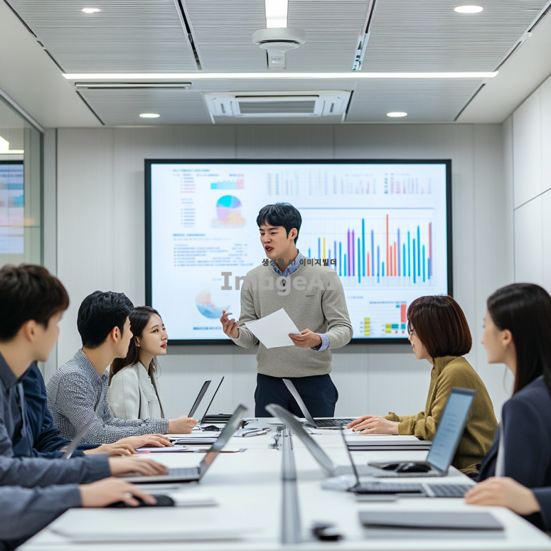 화이트톤의 깔끔하고 단순하며 정돈된 현대적인 회사 회의실 배경, 주변에 모니터에 그래프와 데이터 시각화가 표시되어 있음. 하얀색 회의 테이블을 가운데 두고 비즈니스캐주얼 복장을 한 7명의 한국인 직장인들이 앉아있음. 한 남성이 테이블과 앞에 서서 한 손에는 종이서류를 쥐고 열정적으로 설명하며 회의 중. 테이블에는 각자의 노트북과 마우스, 회의를 위한 서류가 올려져 있음. 밝고 명랑하며 창의적이고 혁신적인 분위기, 전문성과 열정을 나타내는 표정.