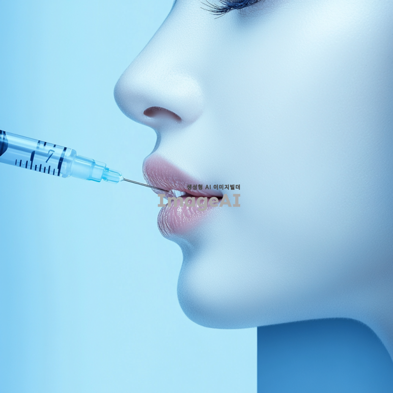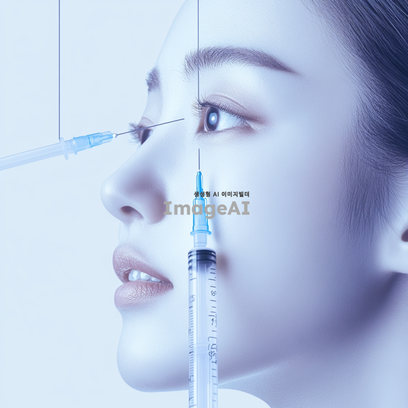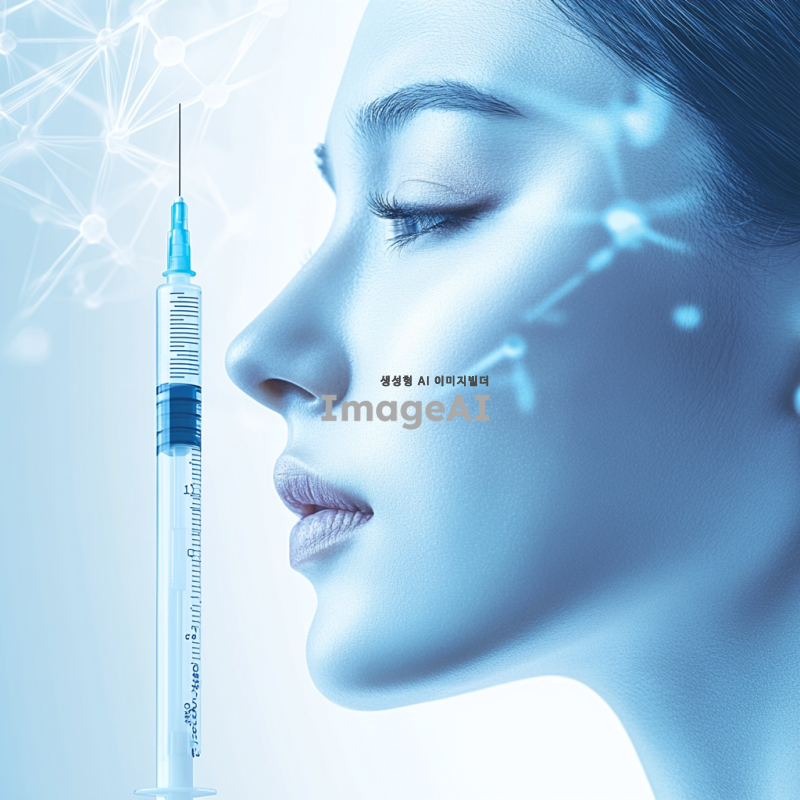 한국인의 얼굴에 비강에 주사기가 맞대어 있는 장면, 차분하고 세련된 분위기, 파란색과 흰색의 배경, 전문적이고 깔끔한 느낌, 의료기기 브로셔에 적합한 이미지.