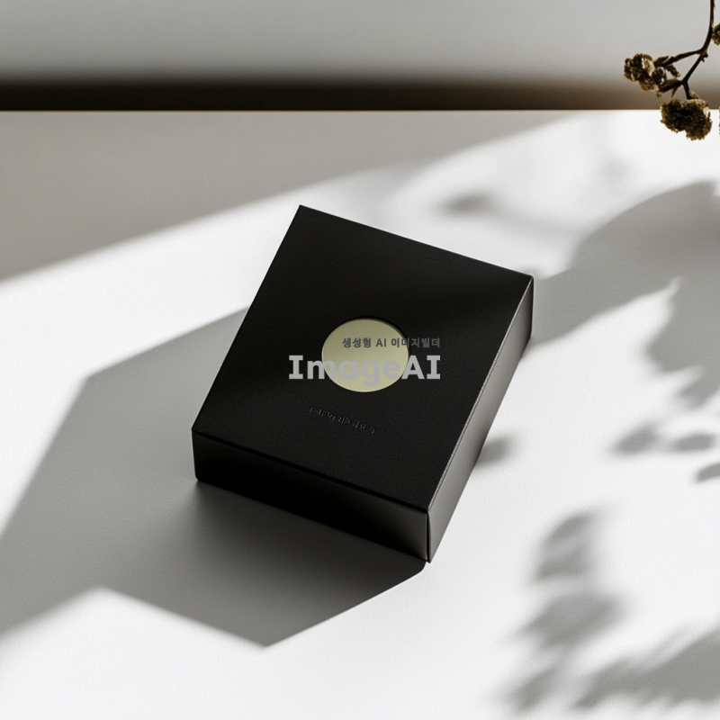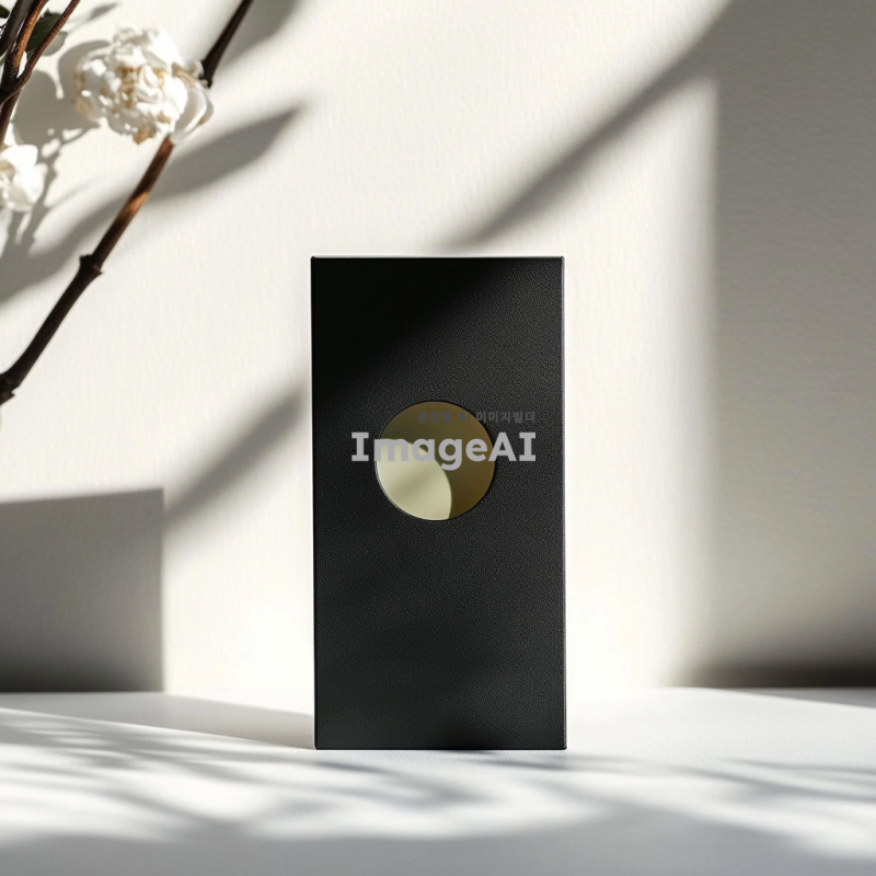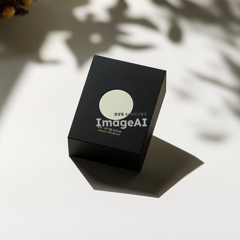검은색 직사각형 향수 패키지 박스, 중앙에 작은 초록색 원이 뚫린 디자인, 깔끔하고 현대적인 스타일, 고급스러운 느낌, 심플한 색상 조합, 미니멀한 디자인 요소, 부드러운 그림자 효과, 자연광 아래 흰 책상 위에 놓인 모습, 한국인 디자이너의 세련된 감각 반영.