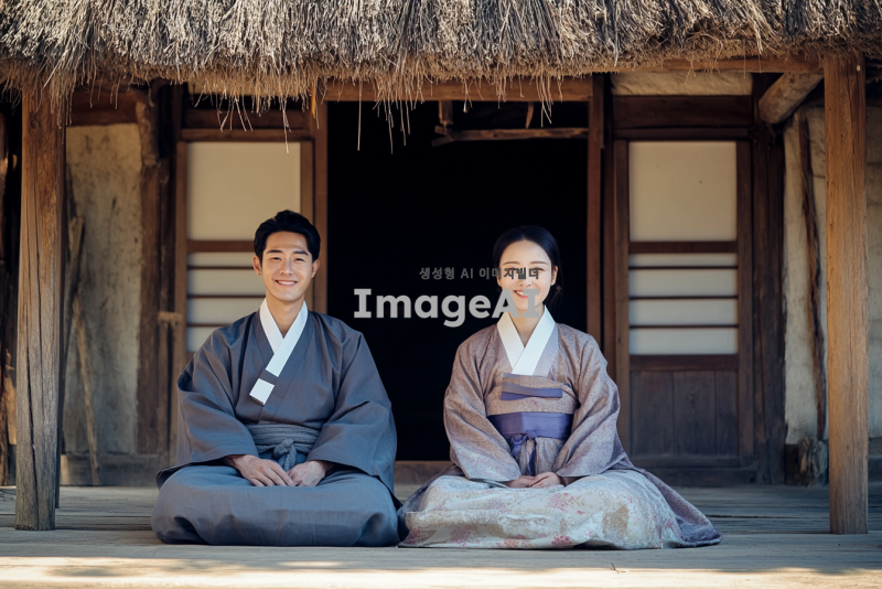 조선시대 배경, 초갓집 마루에 앉아있는 평민 부부, 여자는 임신하여 배가 불룩한 상태, 남자는 행복한 표정, 부부는 매우 가난한 모습, 전통적인 한복을 입고 있으며 주변 환경은 소박하고 단순한 느낌, 따뜻하고 평화로운 분위기.