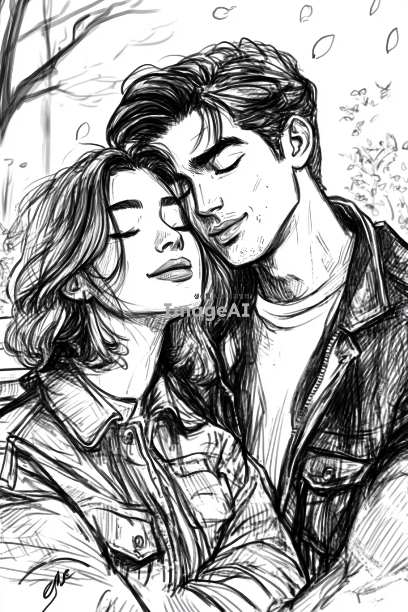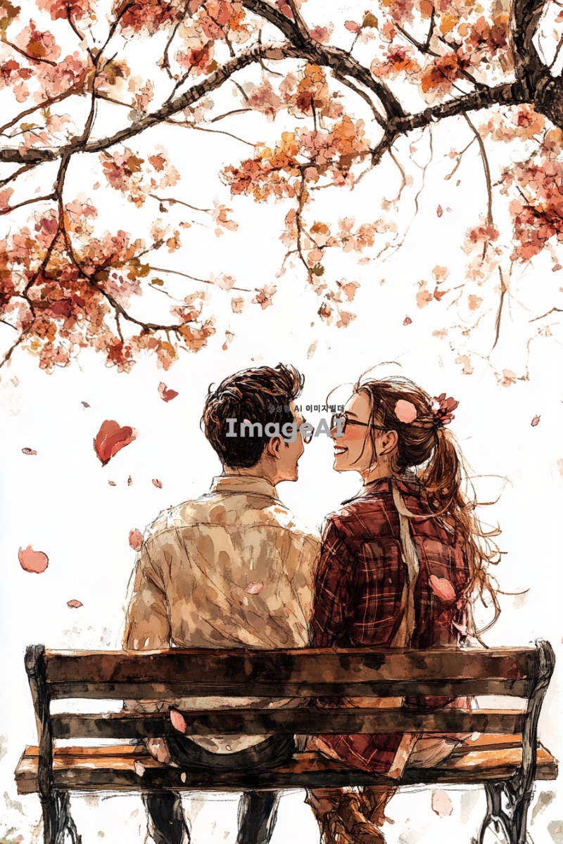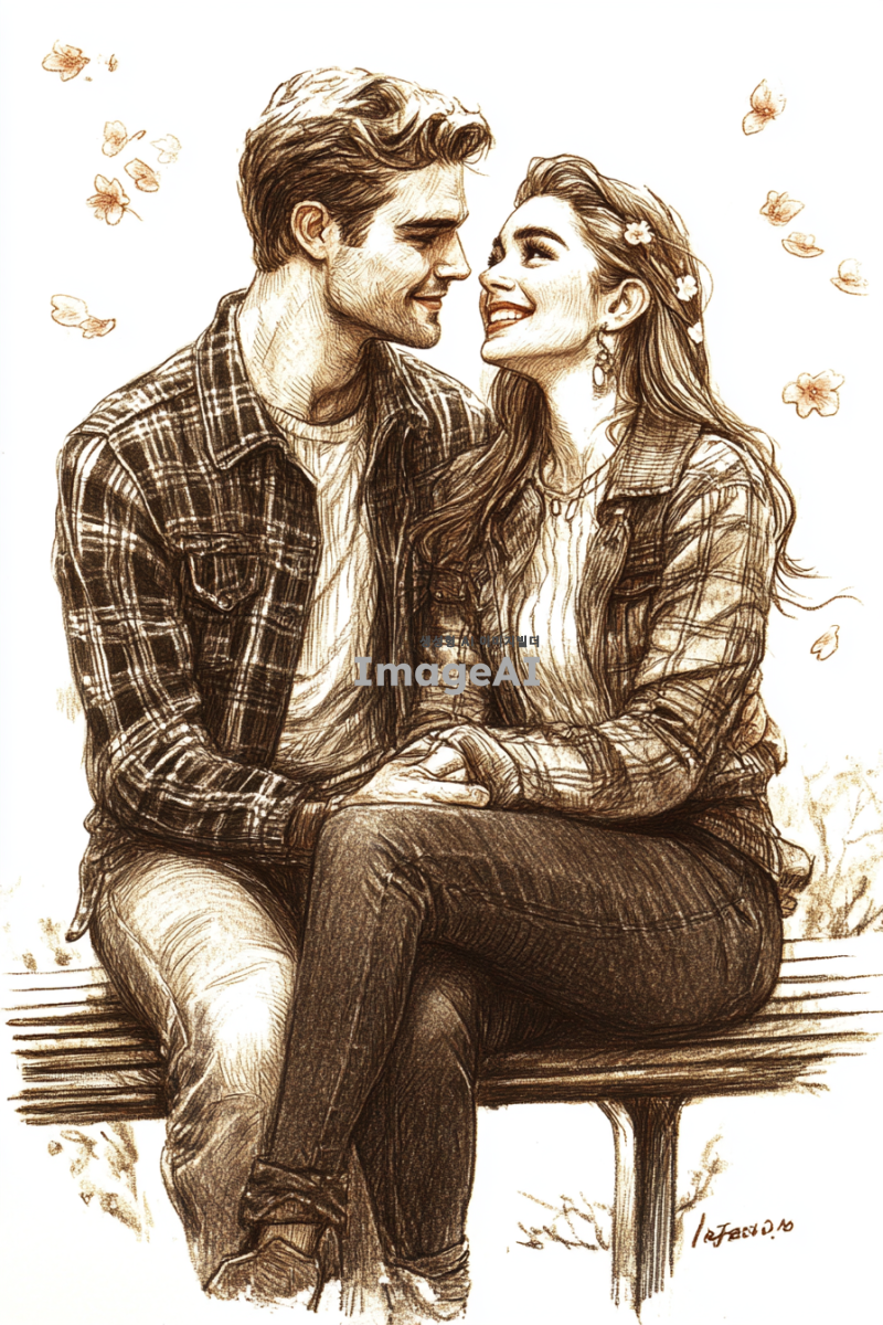 연인과 함께 벤치에 앉아 서로를 바라보며 미소 짓는 모습, 주변에는 벚꽃이 흩날리는 장면, 따뜻한 봄날의 분위기, 선으로만 표현된 섬세한 디테일, 연인의 얼굴에 행복한 감정이 드러나는 표정, 자연스럽고 편안한 자세, 사랑스러운 분위기.