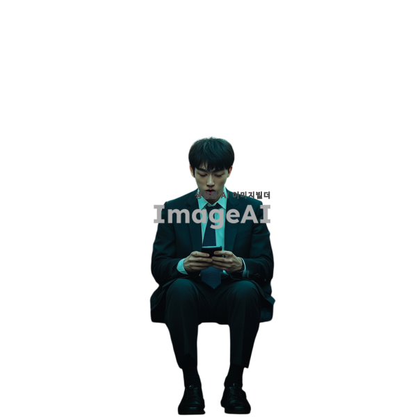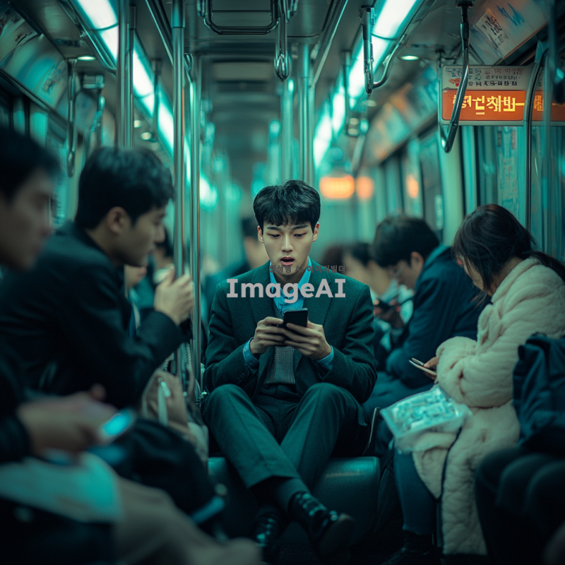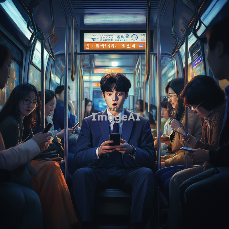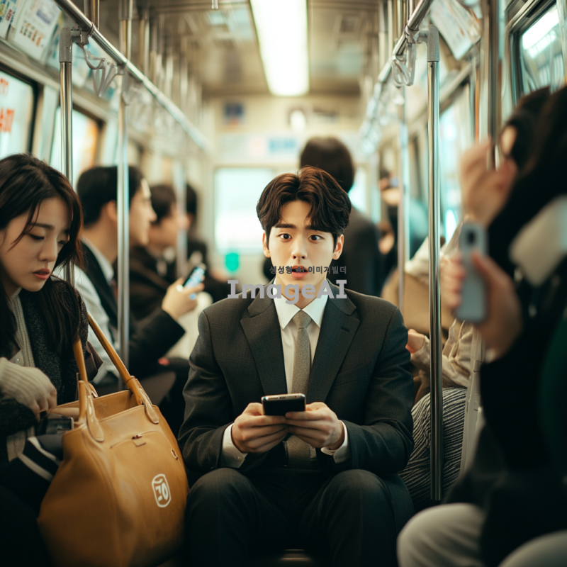 지하철 내부, 현대적인 한국 지하철 차량, 주변에는 다양한 승객들이 앉아있거나 서있는 모습, 중간에 앉아있는 젊은 한국 남자, 정장 옷차림, 핸드폰을 보고 놀란 표정, 눈이 크게 뜨여있고 입이 약간 벌어져 있음, 주변 조명이 부드럽고 자연스러운 느낌, 창문 밖으로는 도시의 풍경이 흐릿하게 보이는 장면.