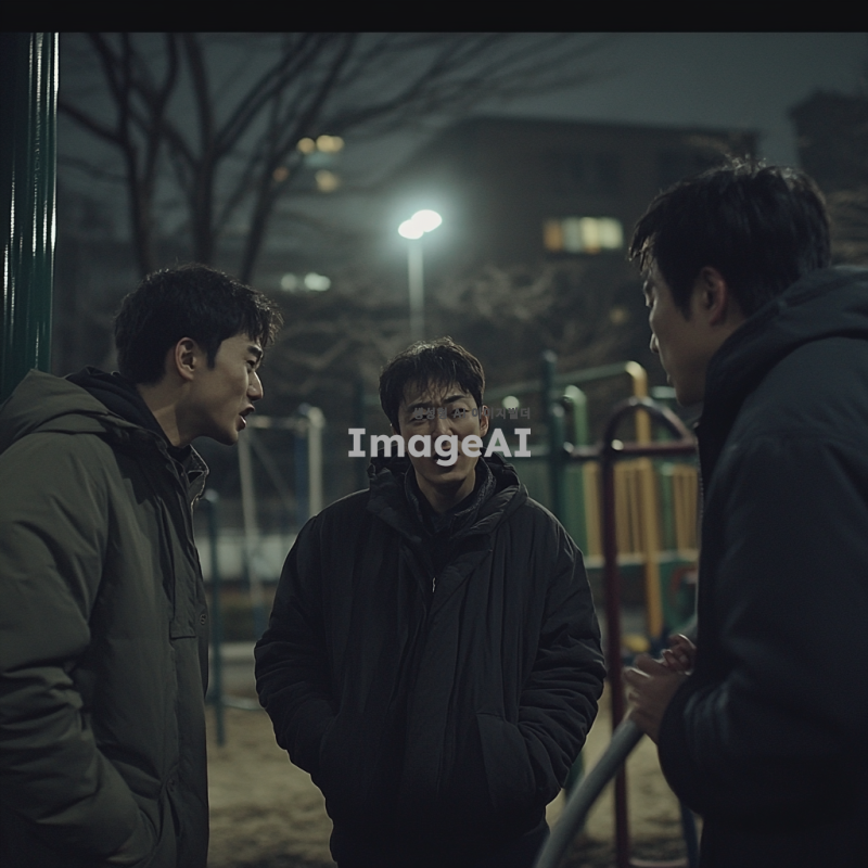 어두운 저녁, 한적한 놀이터에서 세 남자들이 다투고 있다.