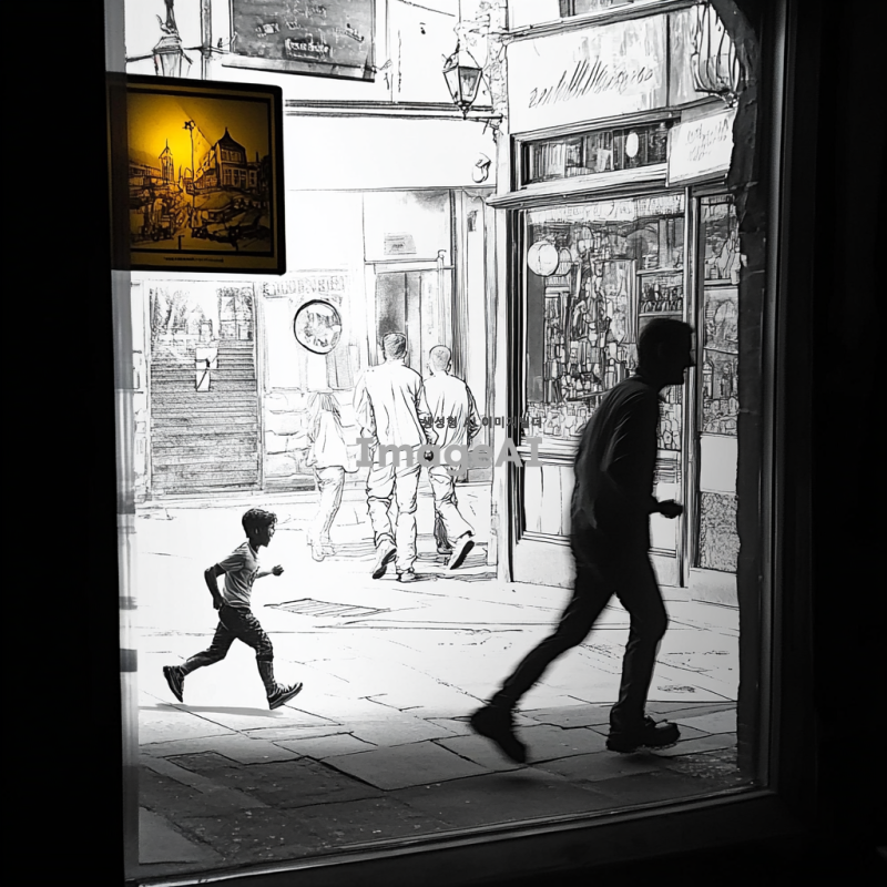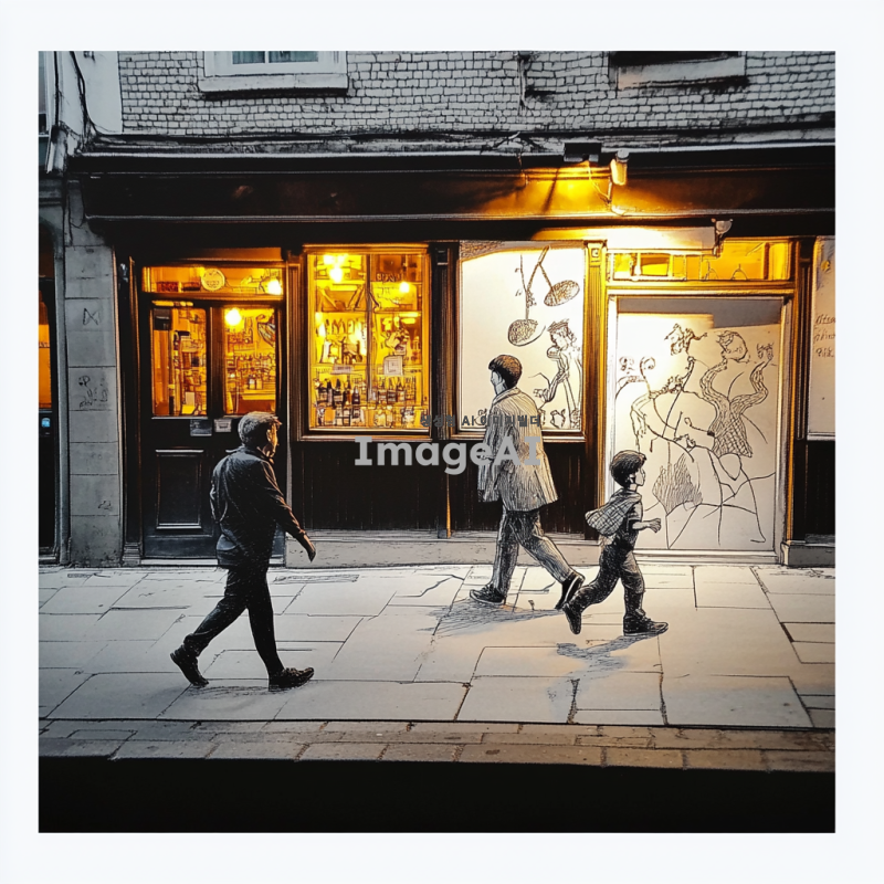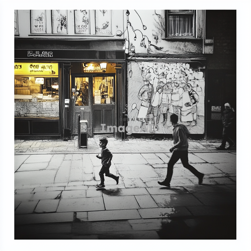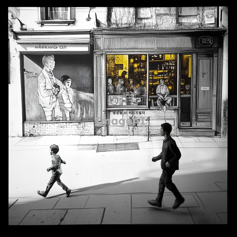거리에 호프집 앞을 지나가는 남자와 뛰어가는 남자아이
