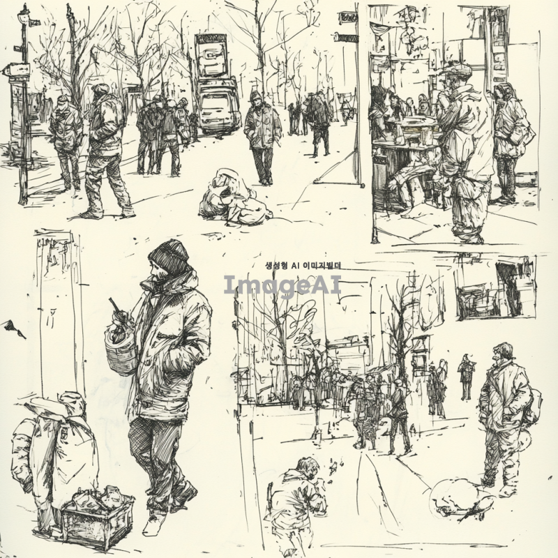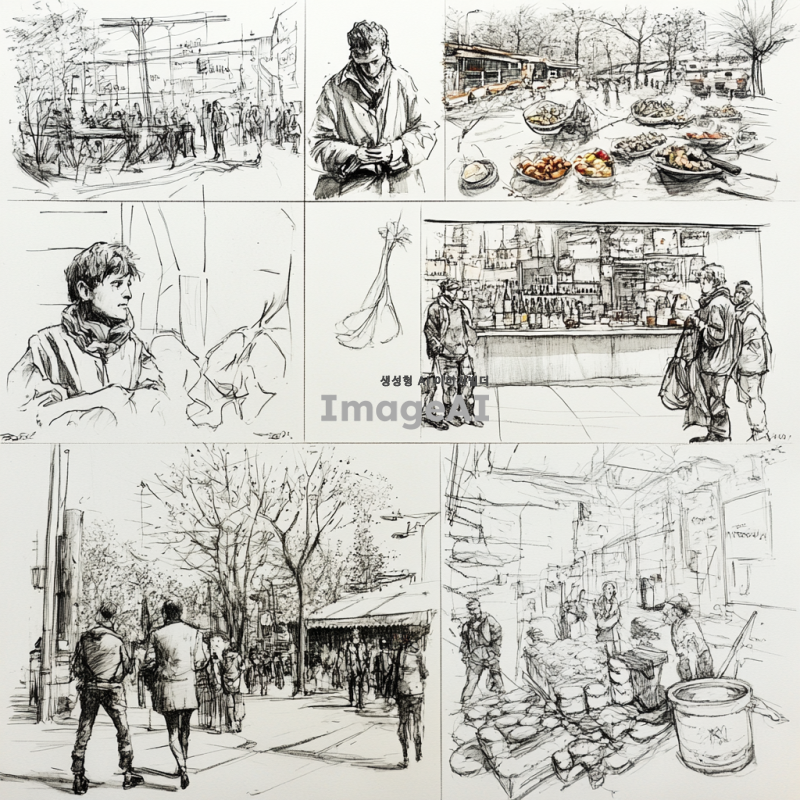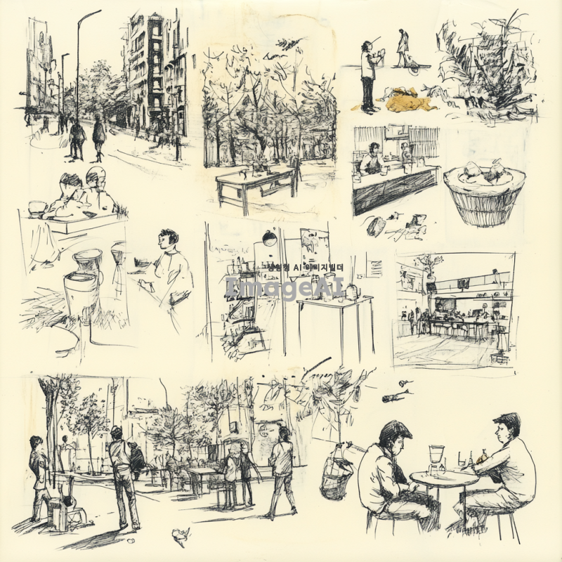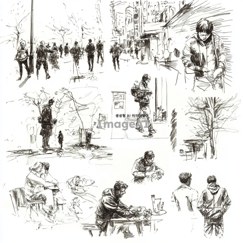- 거리, 숲, 또는 개방된 공간에서 생활하는 사람들을 묘사한 스케치와 그림의 콜라주, 음식, 동물, 식물, 건축물, 손으로 그린 캐릭터와 같은 다양한 객체를 포함합니다. 그림은 거리 모퉁이를 걷는 보행자, 야외에서 노는 아이들, 또는 바 카운터에서 맥주를 마시는 남자들 같은 일상 생활의 다양한 장면을 보여줍니다. 일부 이미지에서는 도시 황폐화 또는 환경 오염의 악센트가 있습니다. 검은 잉크 펜 드로잉, 흰색 배경.