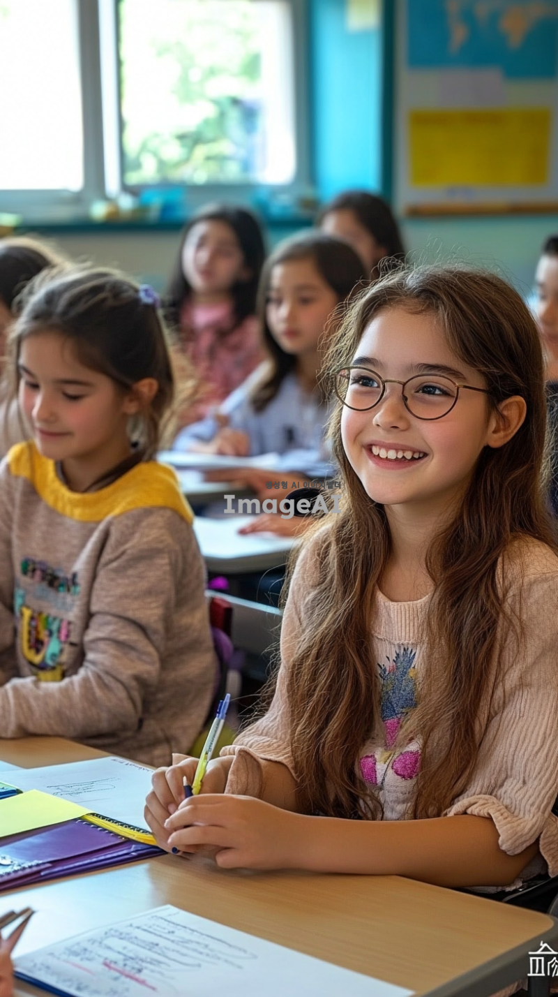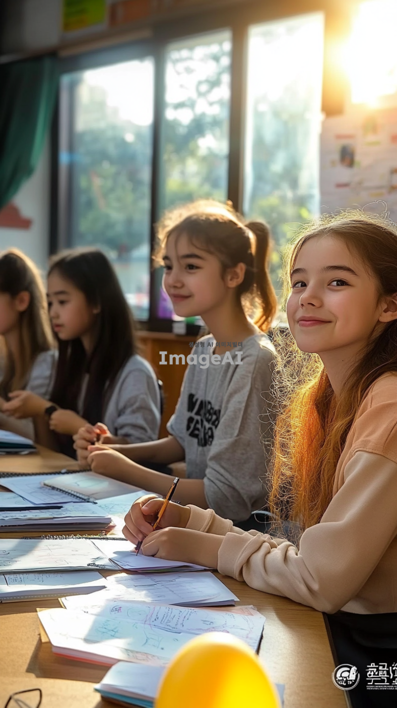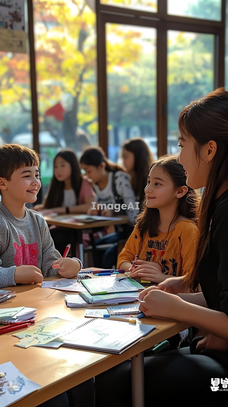 일반 교실 환경, 지적장애 학생과 일반 학생들이 함께 협력하여 공부하고 있고, 학생들은 서로 도와주며 웃고 있고, 창문으로 햇빛이 들어와 밝은 분위기를 연출, 교사는 학생들 곁에서 지원하고 있는 모습, 모두가 협력하고 존중하는 분위기