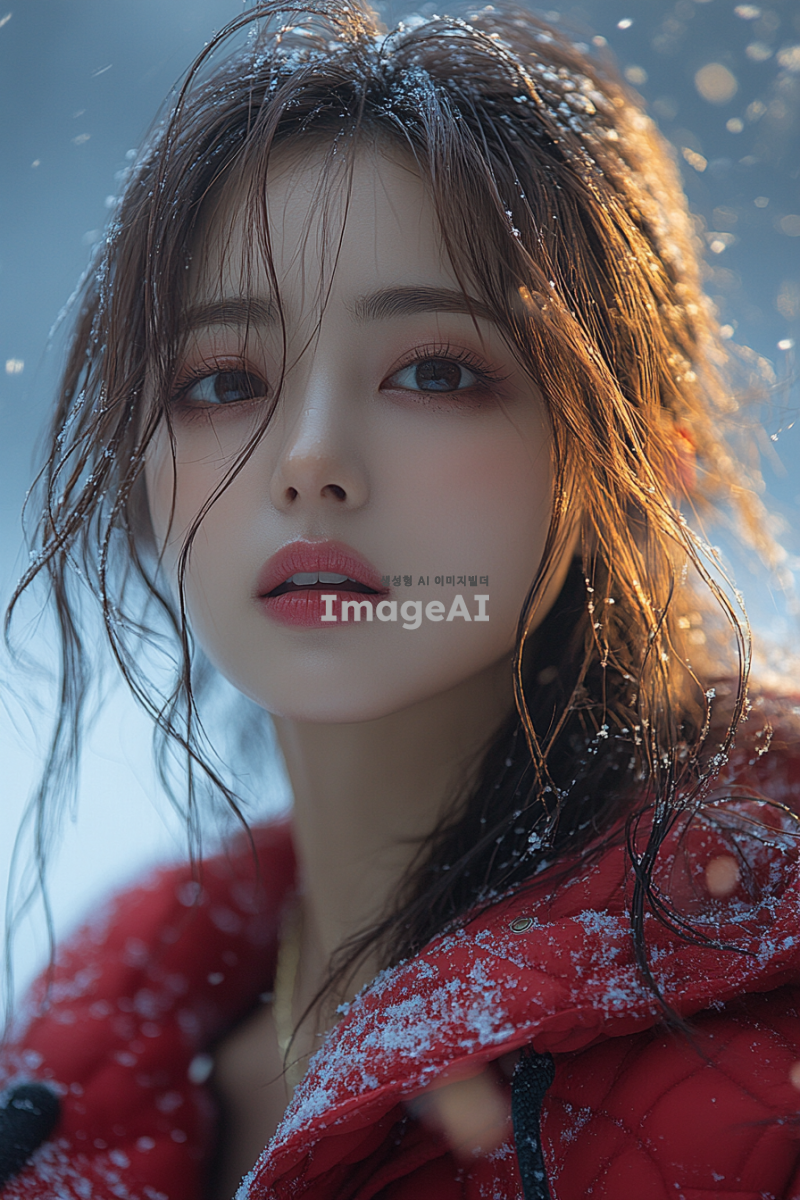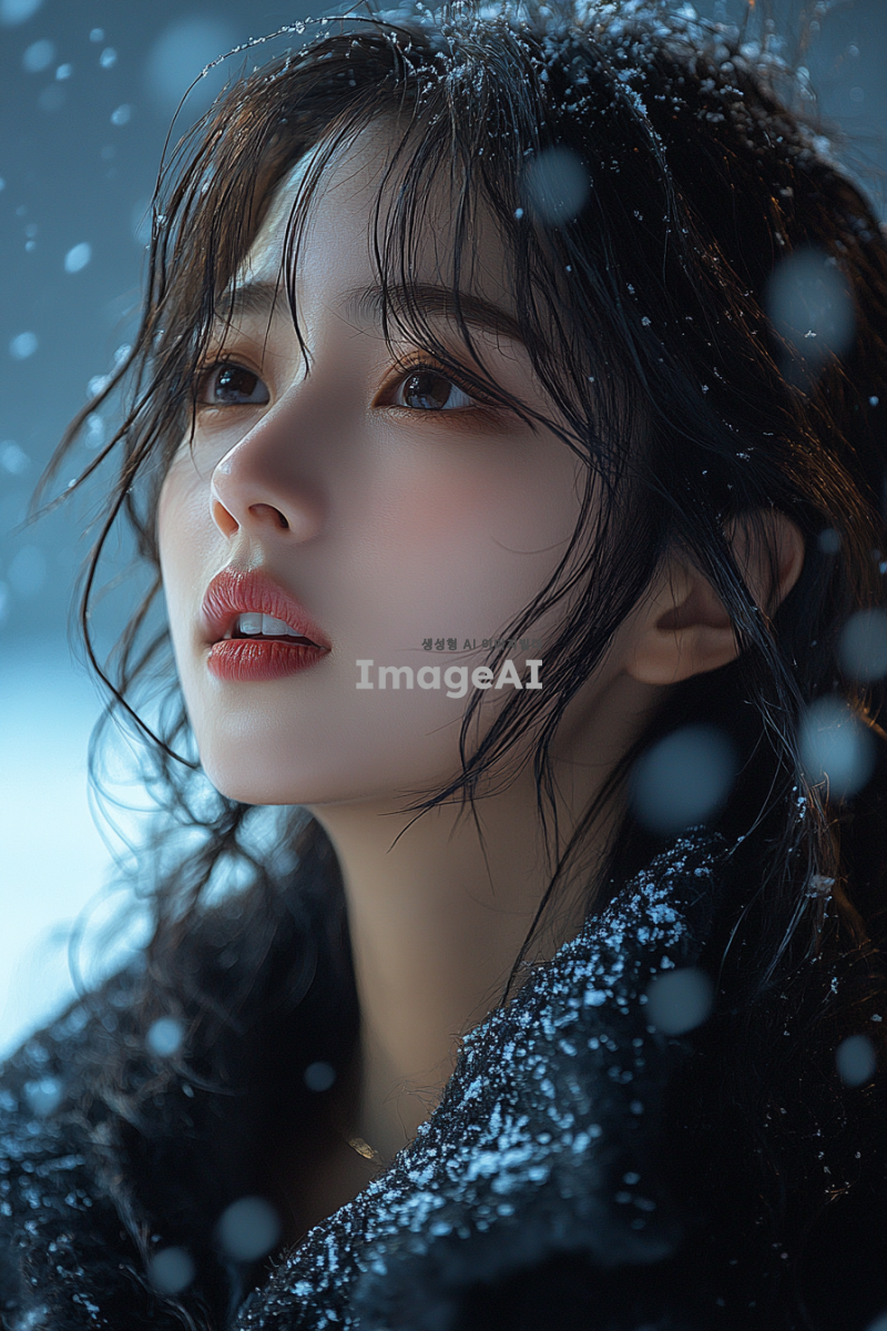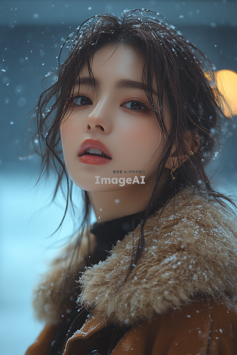 겨울 테마의 아이돌 무대에서 공연 중인 한국인 여성, 다양한 스타일의 겨울 의상을 입고 있으며, 무대의 조명과 배경이 함께 어우러져 생동감 넘치는 장면. 겨울의 차가운 분위기와 아이돌의 열정적인 퍼포먼스가 조화를 이루는 모습.