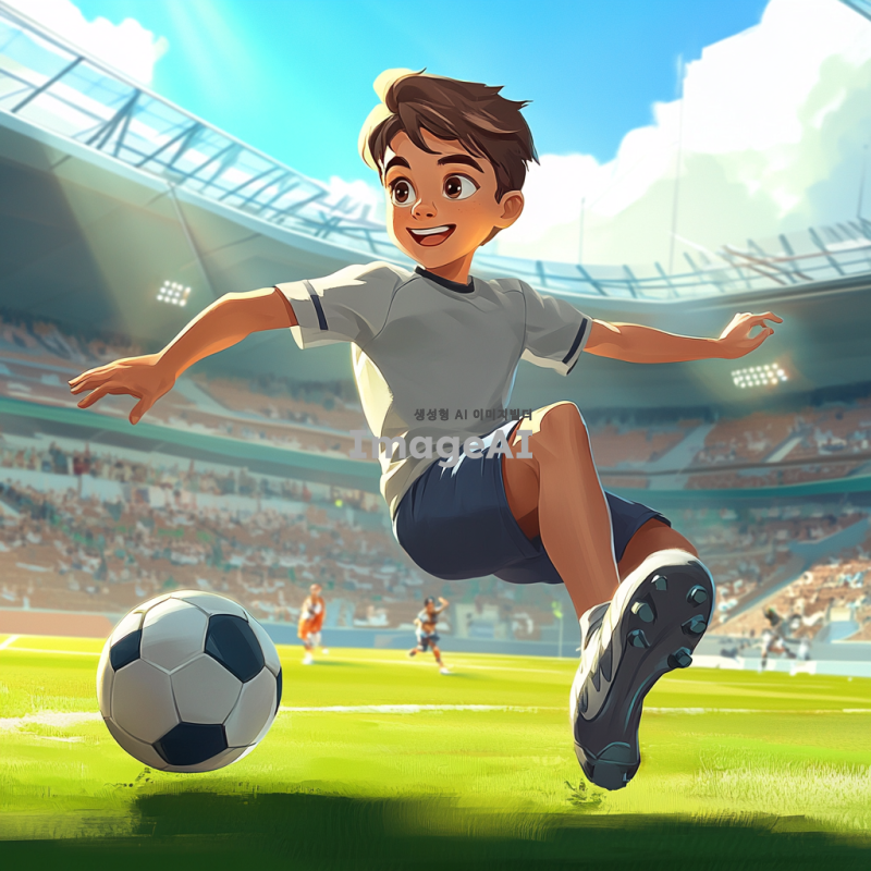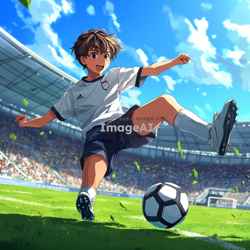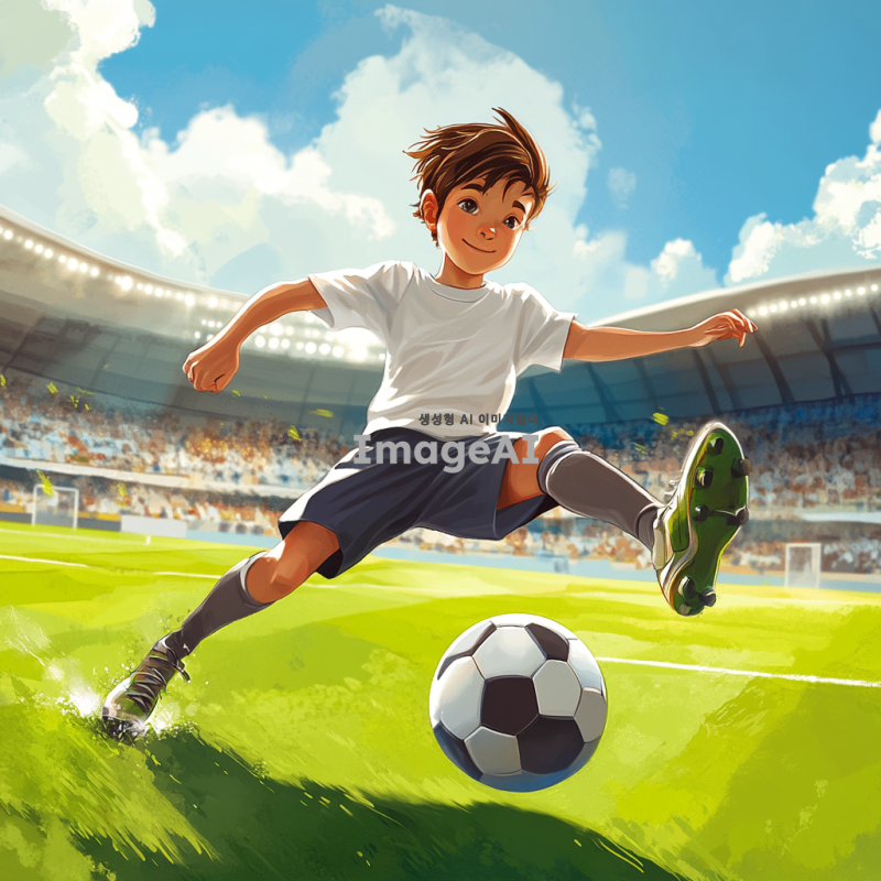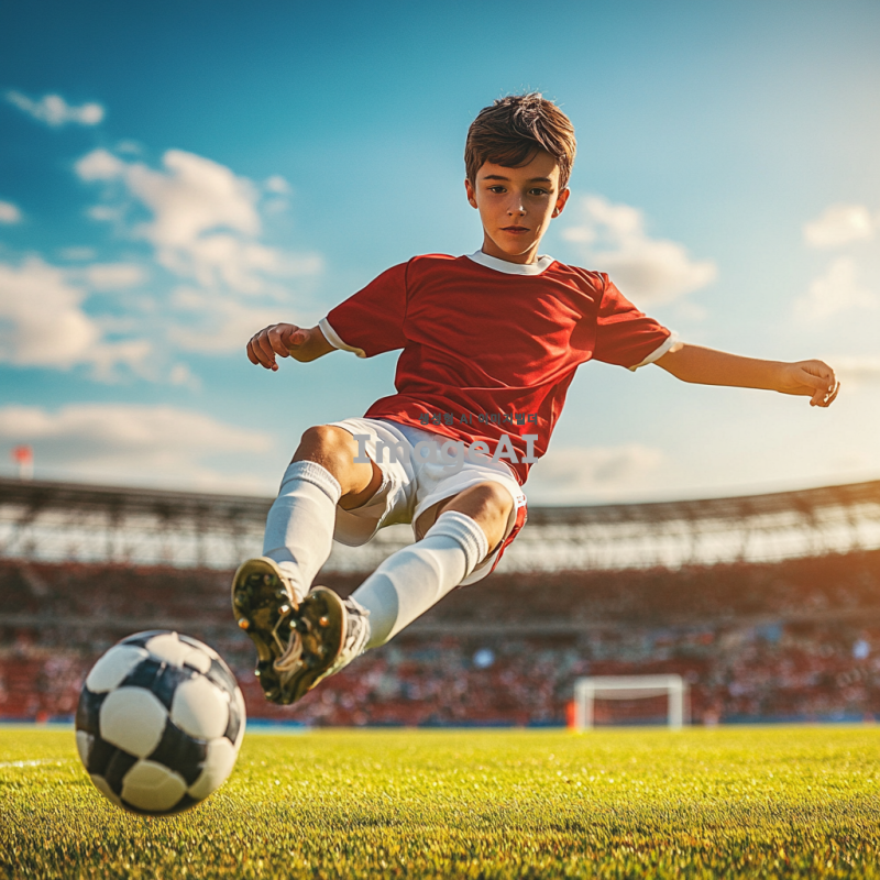 축구 경기장에서 갈색 머리를 가진 청소년 남자가 축구공을 차고 있는 모습, 역동적인 포즈, 운동복을 입고 있으며, 배경에는 푸른 잔디와 관중석이 보임, 햇빛이 밝게 비추고 있는 오후 시간, 활기차고 에너지 넘치는 분위기