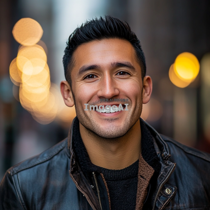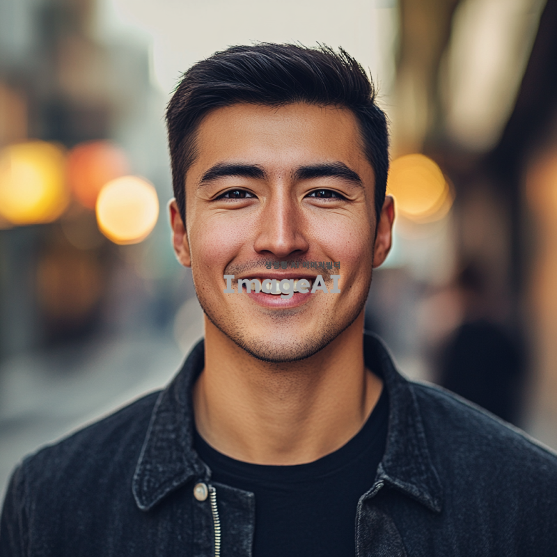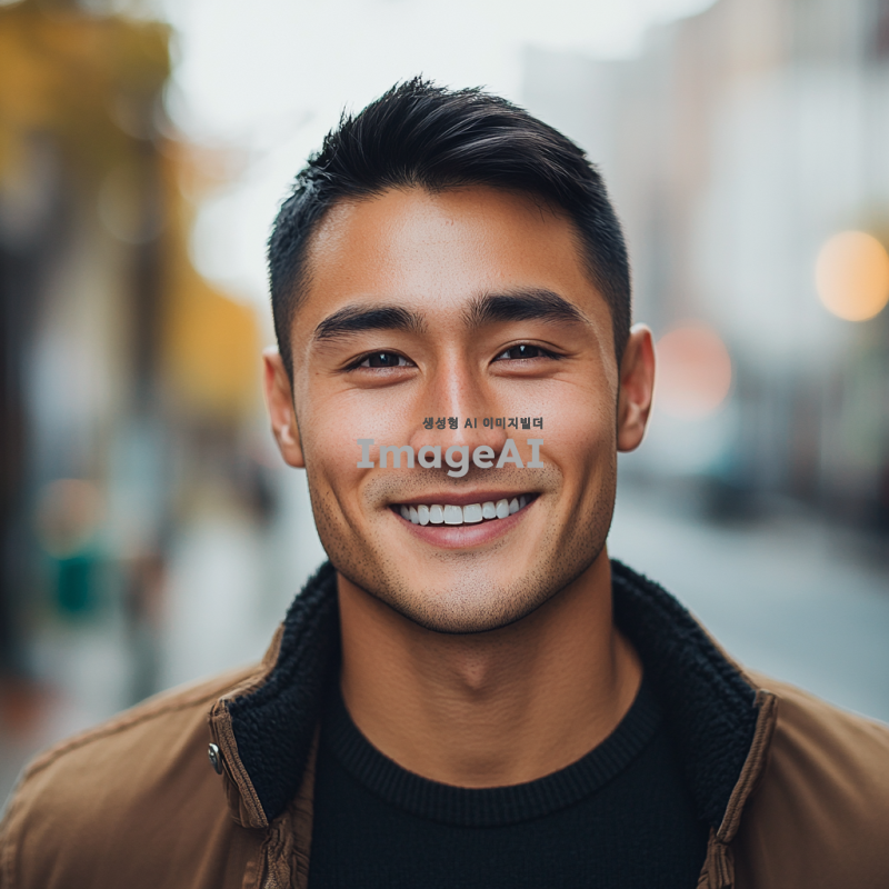 20대 중반의 잘생긴 남자, 짧은 검은 머리, 깨끗한 피부, 깊고 매력적인 눈, 스타일리시한 캐주얼 복장, 자연스러운 미소, 도시의 거리 배경, 부드러운 조명, 현대적이고 세련된 분위기.