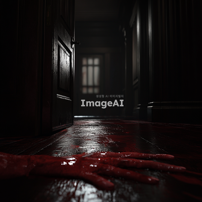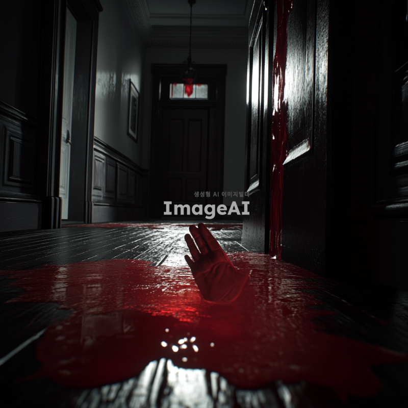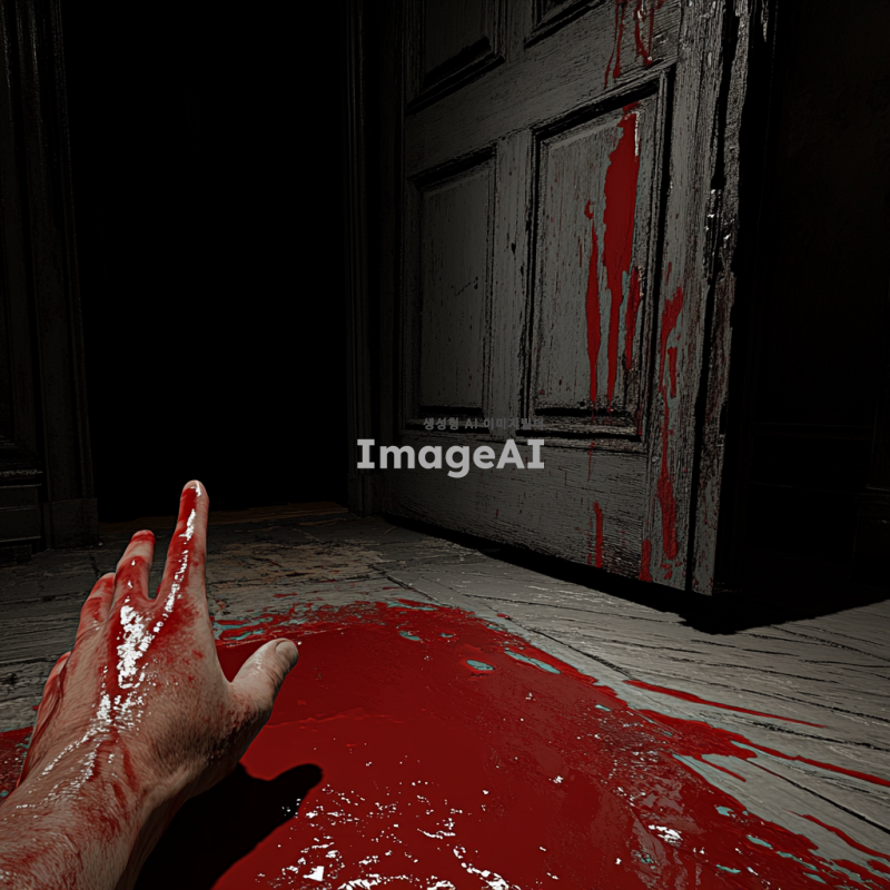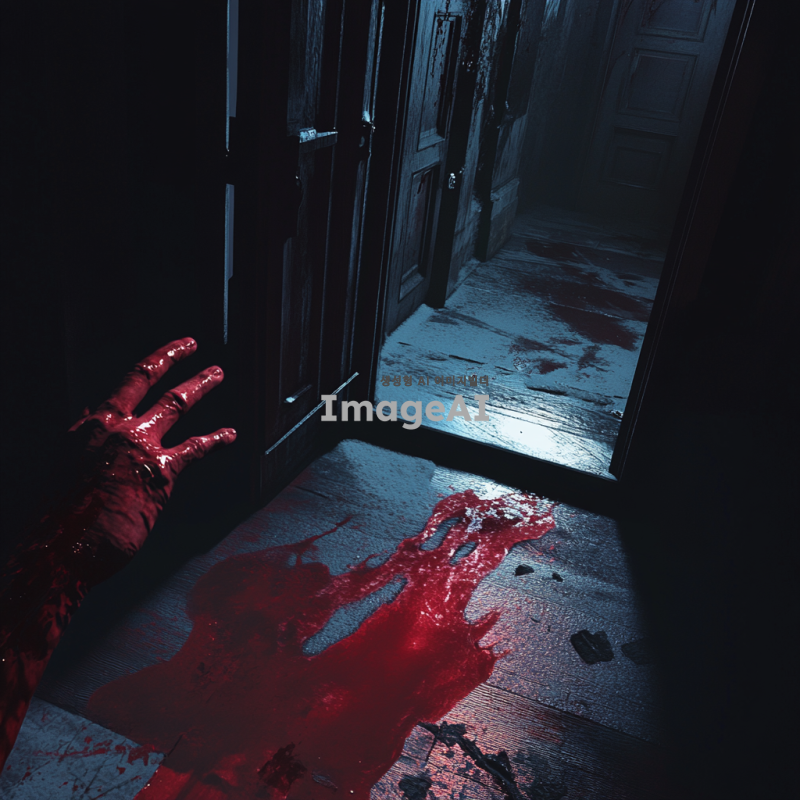 어두운 분위기의 현관, 바닥과 문에 빨간 액체가 묻어있음, 1인칭 시점에서 빨간 액체에 조금 젖은 손이 보임, 전체적으로 음침하고 긴장감 있는 분위기, 저조도 조명, 그림자 강조, 현실적이고 세부적인 묘사.