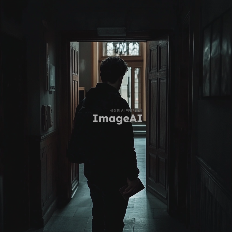 어두운 복도에 서서 살짝 열린 문 안쪽을 조심스럽게 들여다보는 남자의 뒷모습, 남자는 한 손에 지갑을 들고 있으며, 긴장감 있는 분위기가 감도는 장면, 전체적인 색조는 어둡고 미묘한 긴장감을 강조.