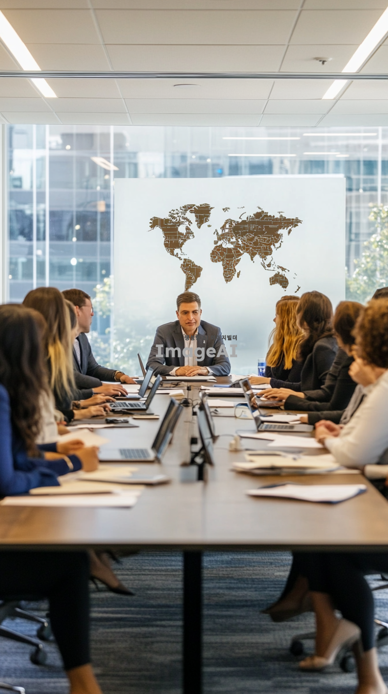 현대적인 회의실에서 국무총리가 회의를 주재하는 모습, 긴 테이블을 중심으로 다양한 연령대의 사람들이 앉아 있으며 노트북과 서류가 놓여 있음, 국무총리는 정장 차림으로 중앙에 앉아 있으며 진지한 표정으로 회의 진행, 회의실 벽에는 세계 지도가 걸려 있고 창문을 통해 자연광이 들어옴, 참석자들은 집중하여 국무총리의 말을 경청하고 있음, 현대적이고 깔끔한 인테리어, 전체적으로 프로페셔널하고 차분한 분위기.