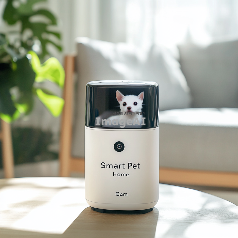 밝고 현대적인 거실에 놓인 세련된 디자인의 반려동물 홈캠, 카메라 렌즈가 돋보이며, 화면에 "스마트 반려동물 홈캠"이라는 글씨가 깔끔한 폰트로 적혀 있는 모습, 주변에는 깔끔하게 정돈된 가구와 식물이 배치되어 아늑한 분위기를 연출하고, 햇살이 창문을 통해 부드럽게 들어오는 장면.