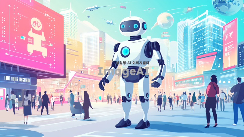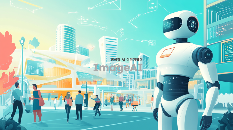 미래 도시의 배경에 서 있는 AI 로봇, 로봇은 친근한 외형으로 설계되어 있으며, 사람들과 상호작용하는 모습. 주변에는 다양한 기술 장치들이 배치되어 있고, 사람들이 로봇의 도움을 받으며 일상생활을 하는 장면. 첨단 기술과 인간의 조화로운 공존을 강조하는 분위기. 밝고 희망적인 색감.