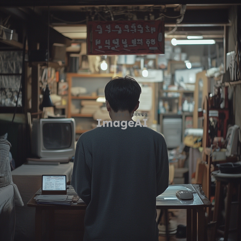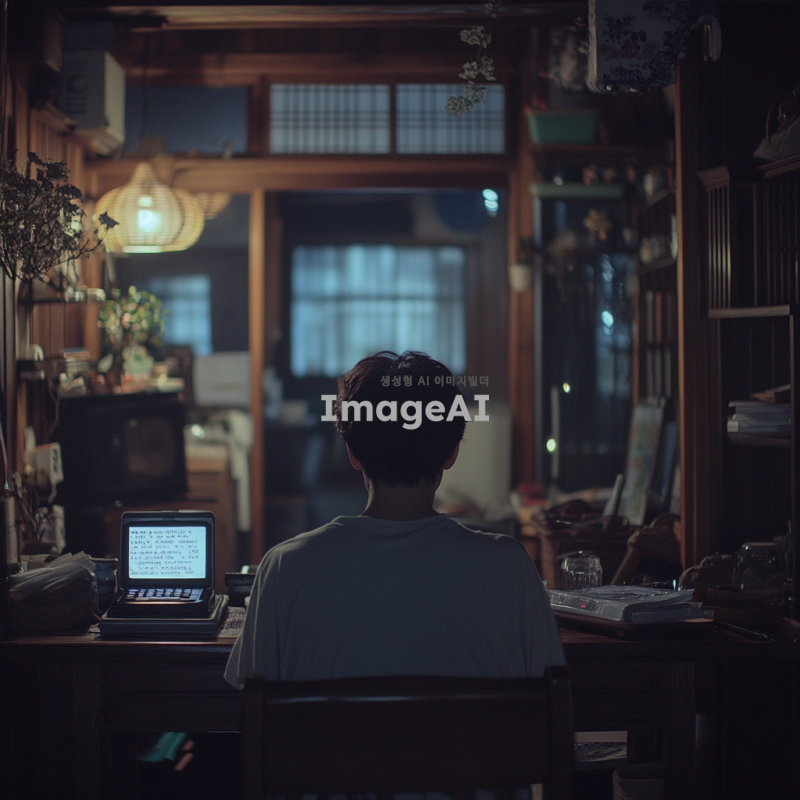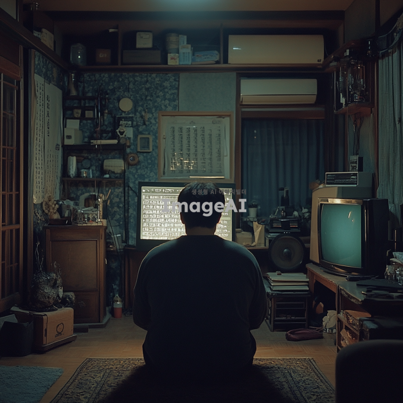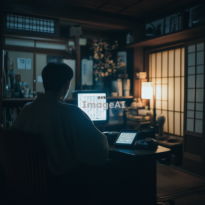 어두운 방 안에서 남자가 폴더폰으로 다른 폴더폰의 문자 내역을 촬영하고 있는 장면. 방은 아기자기하게 꾸며져 있으며, 한국 스타일의 인테리어가 돋보인다. 방의 불은 꺼져 있어 조심스럽고 은밀한 분위기가 감돈다. 남자의 뒷모습이 보이며, 주위의 가구와 소품들이 방의 따뜻한 느낌을 더한다.