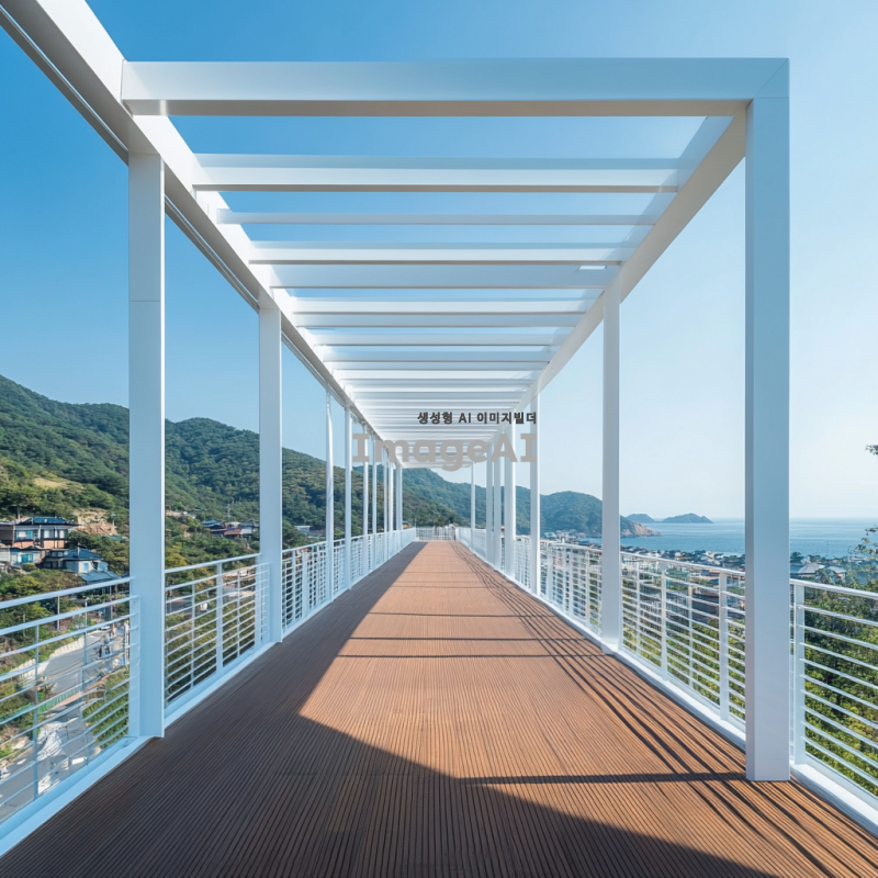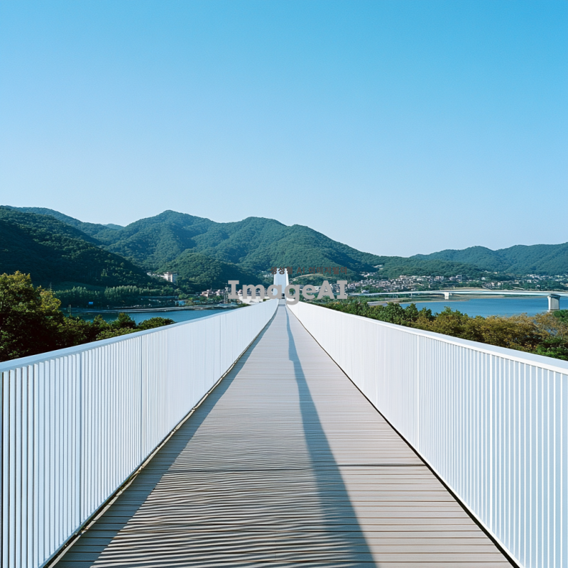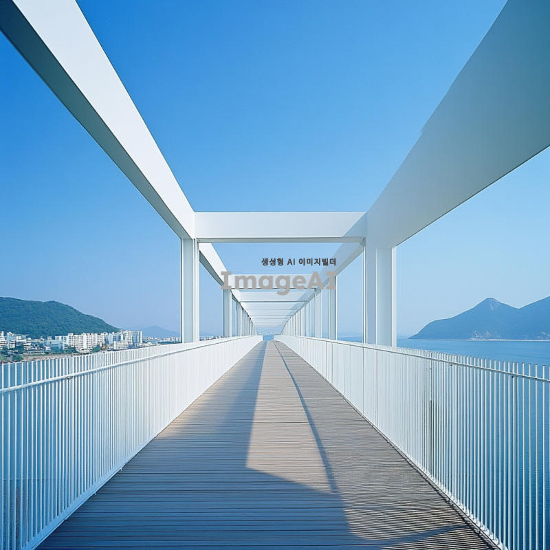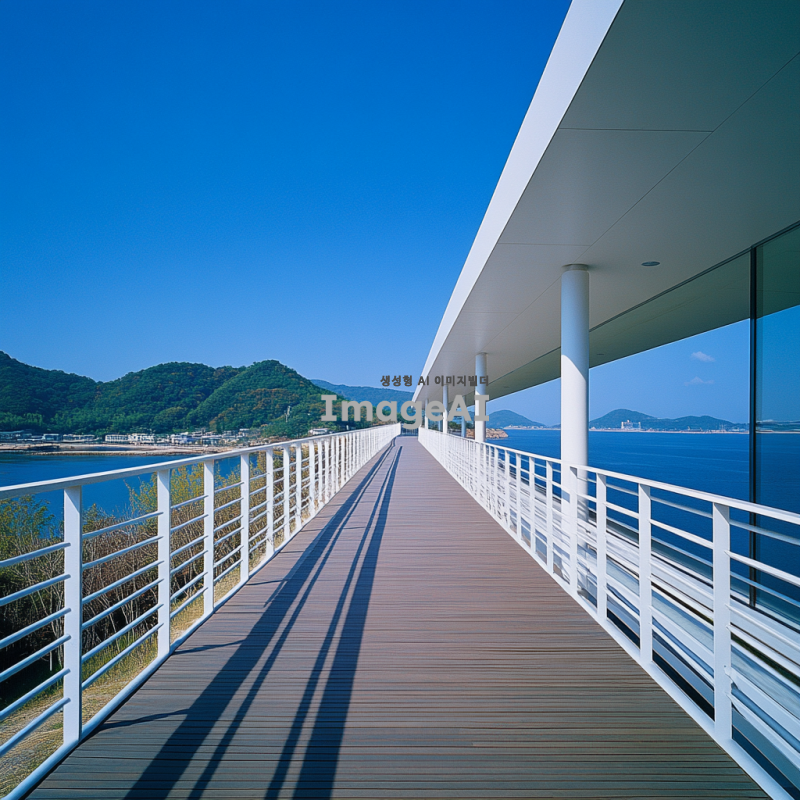 3. 건축가 타다오 안도가 설계한 하얀 강철 구조의 보행자 다리, 한국의 바다와 산 풍경을 내려다보는 모습. 주변 건축물의 양식은 단순하면서도 우아하며, 맑은 푸른 하늘이 위에 있다. 긴 나무 산책로가 다리 한쪽의 높은 플랫폼으로 이어져 있으며, 아래 한문리 마을의 전경을 제공한다. 도로 양쪽에는 금속 가드레일 벽이 있어 디자인에 세부 사항과 시각적 흥미를 더한다.