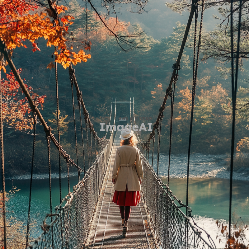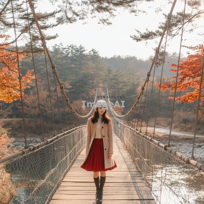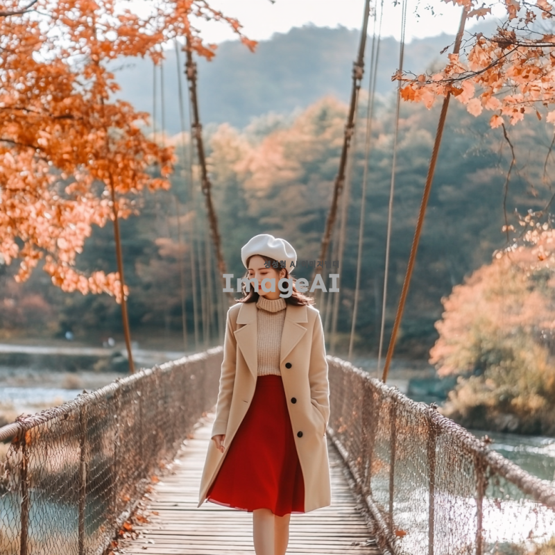 출렁다리를 건너고 있는 여인, 빨간 스커트와 베이지색 코트를 입고 있으며, 하얀 베레모를 쓴 30대의 키가 큰 여인, 한국의 자연 경관과 어우러진 배경, 다리 아래로 보이는 맑은 강물, 주변에 가을 단풍이 든 나무들, 따뜻한 햇살이 비치는 장면.