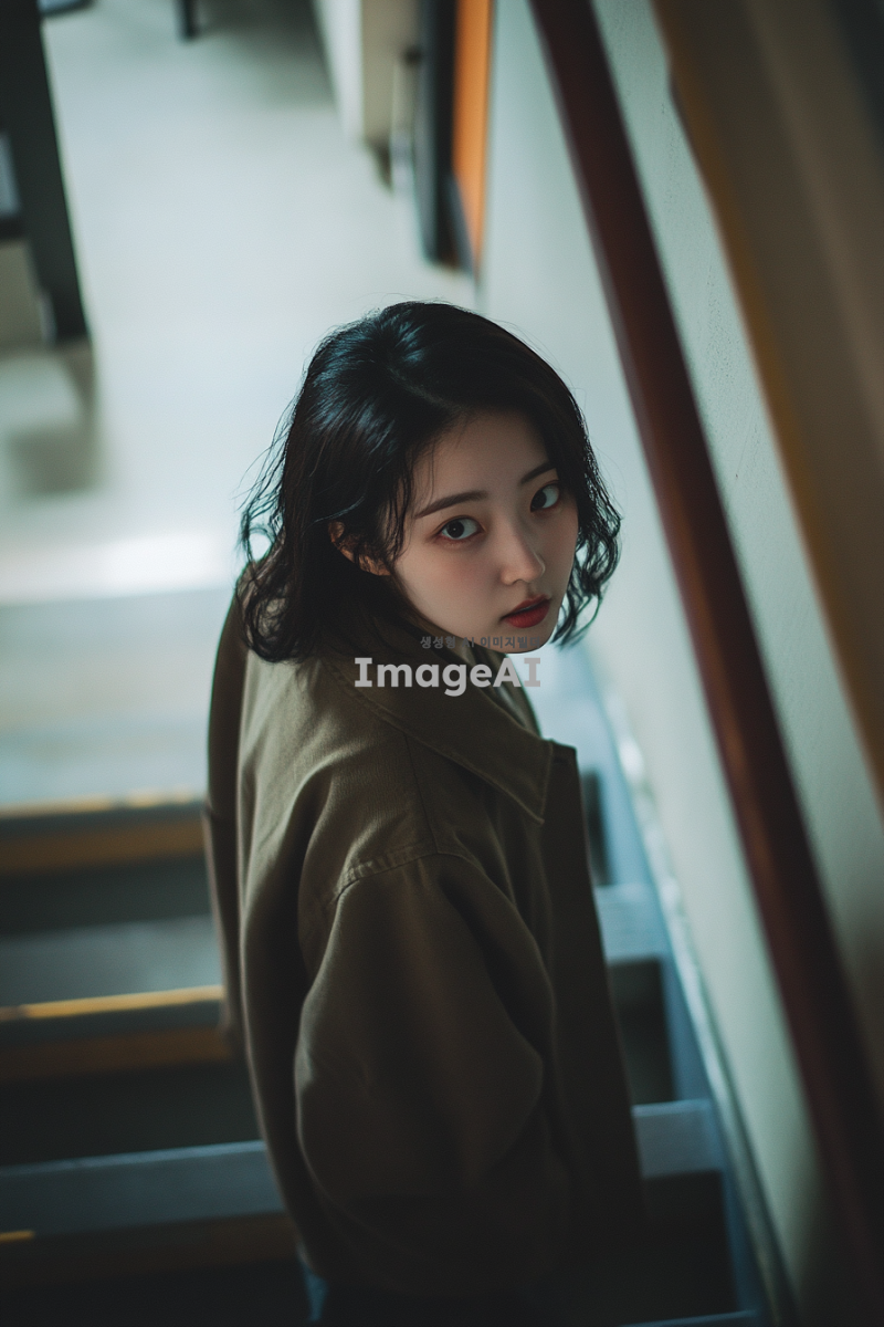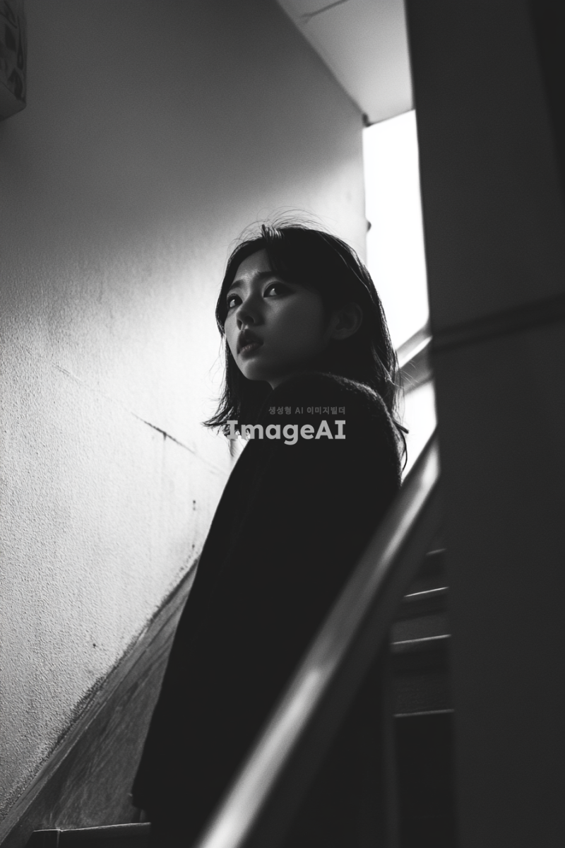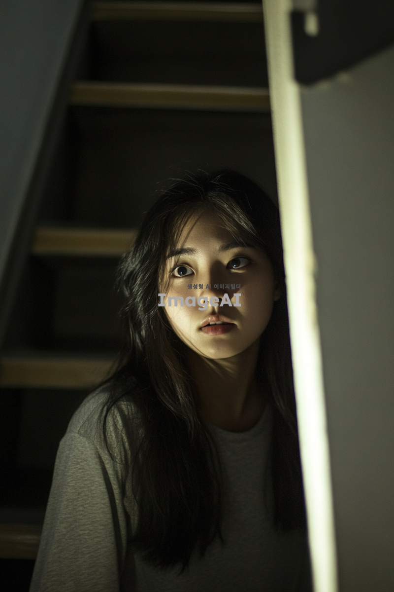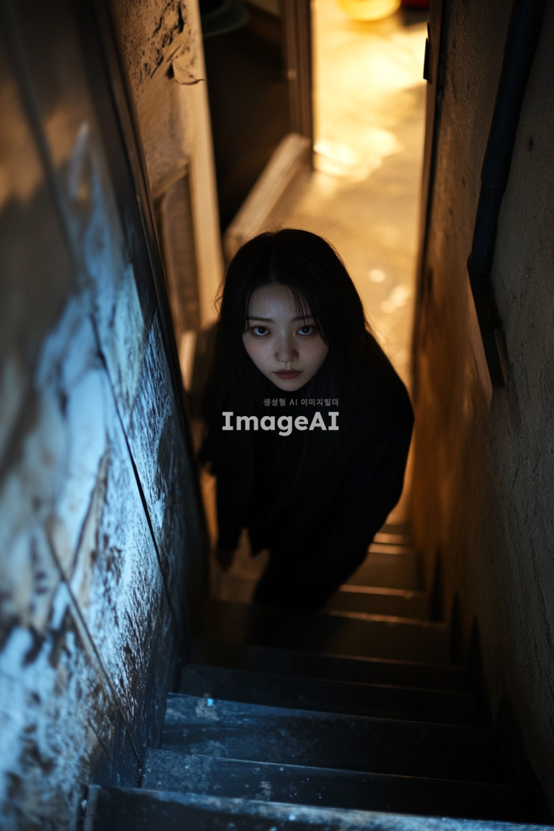한국 여자가 계단을 올라가며 들리는 말소리에 수상함을 느끼는 장면을 여자 얼굴은 잘 안보이게 만들어줘
