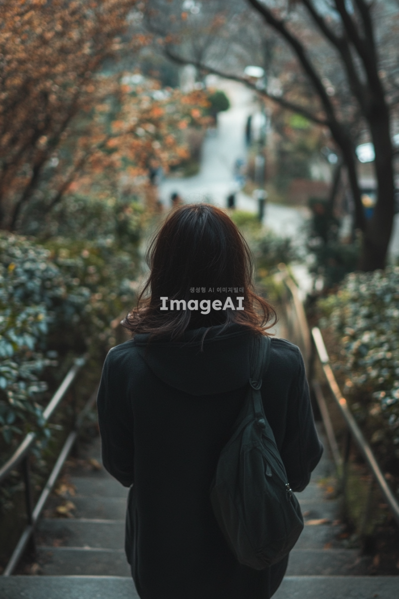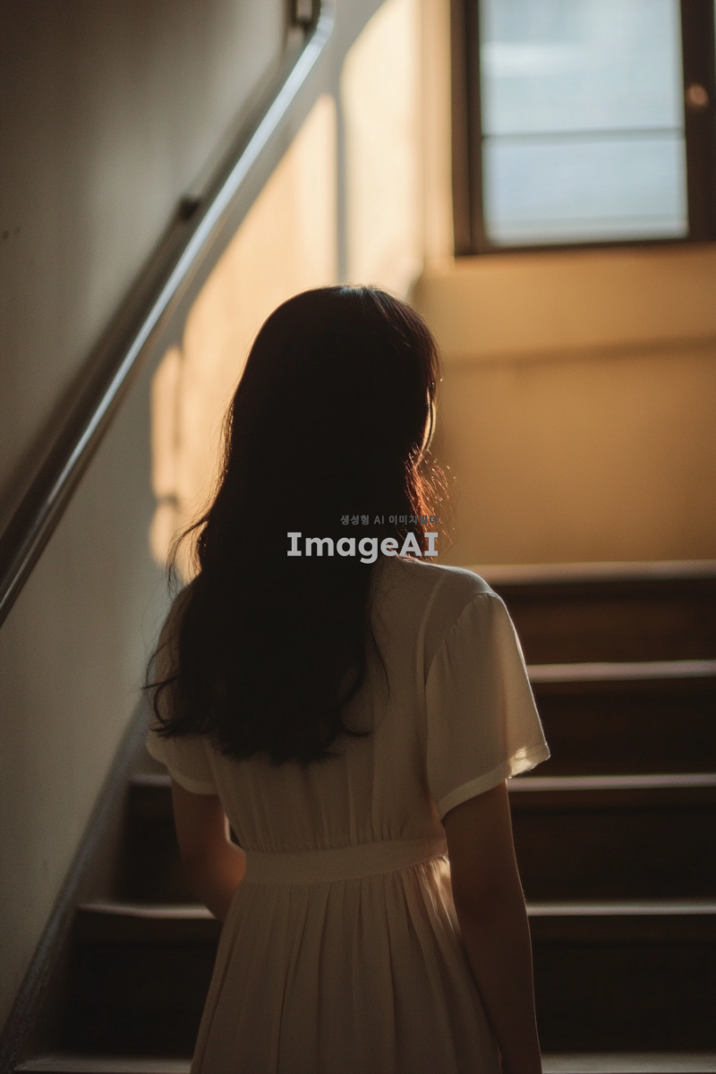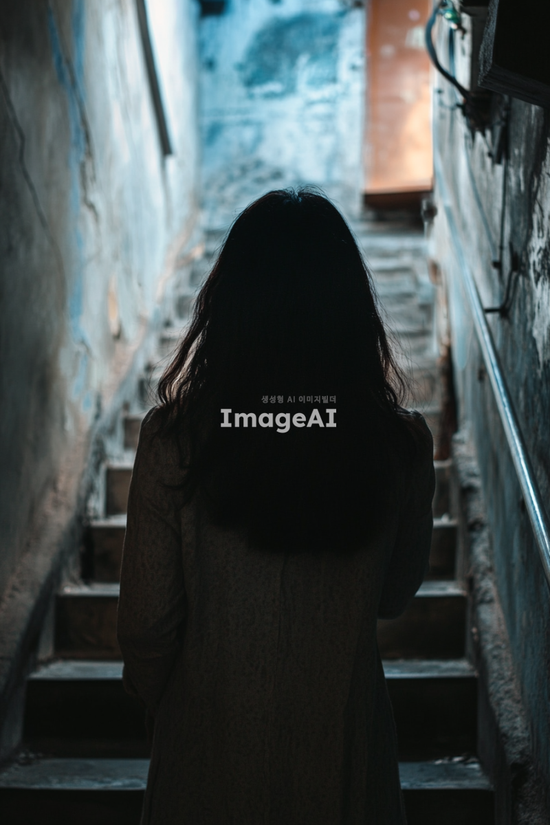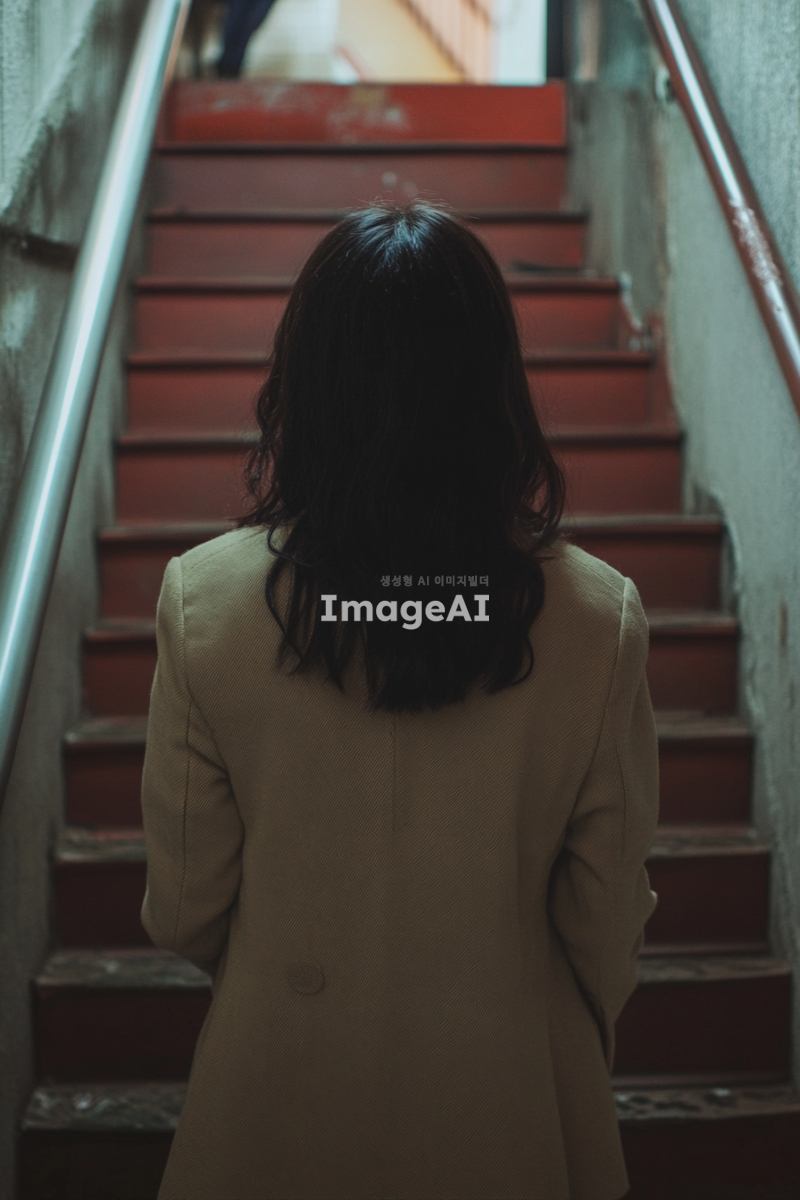 계단을 올라가며 들리는 말소리에 귀를 기울이며 수상함을 느끼는 한국 여자 뒷모습을 만들어줘