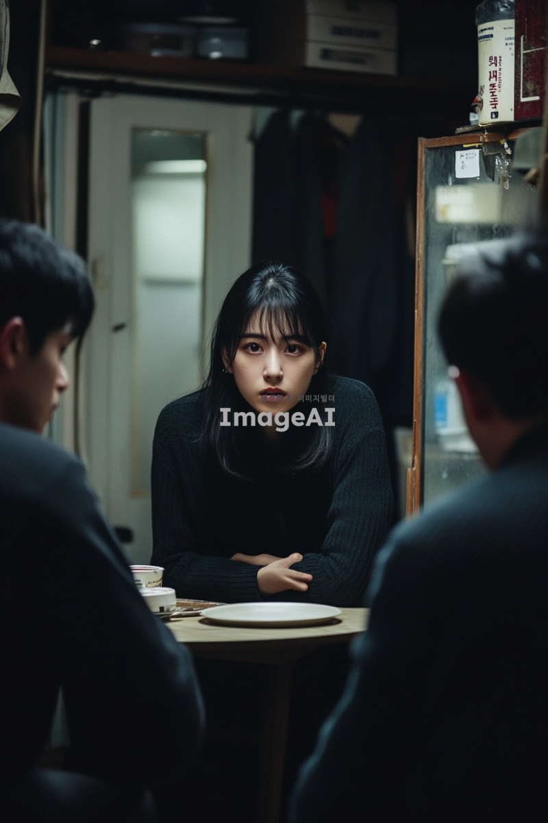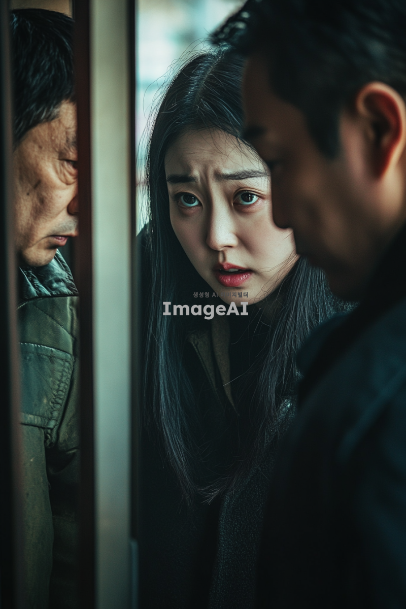 한국 여자가 집에서 남자를 신고하려는 모습과 이를 막는 남자와 이야기를 듣는 남자의 세 모습을 얼굴이 안보이는 각도의 장면