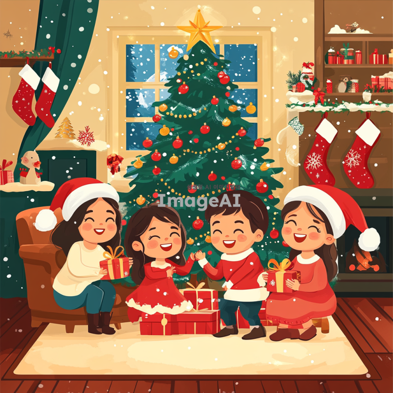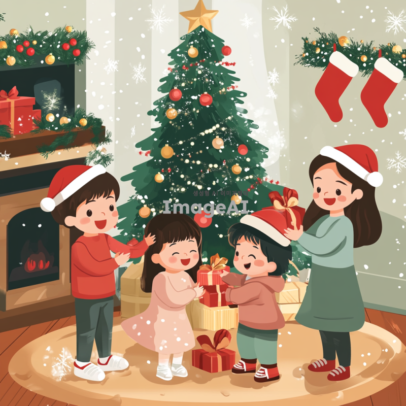 크리스마스 테마의 카툰 이미지, 한국인 가족이 크리스마스 트리 옆에서 선물을 교환하며 환하게 웃고 있는 장면, 아늑한 거실 배경, 벽난로에 걸린 크리스마스 양말, 눈이 내리는 창밖 풍경, 따뜻하고 밝은 색감, 가족 모두 산타 모자 착용, 트리에는 반짝이는 장식과 별이 달려있음, 즐겁고 행복한 분위기.