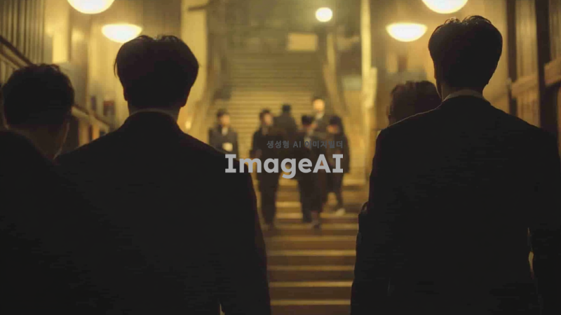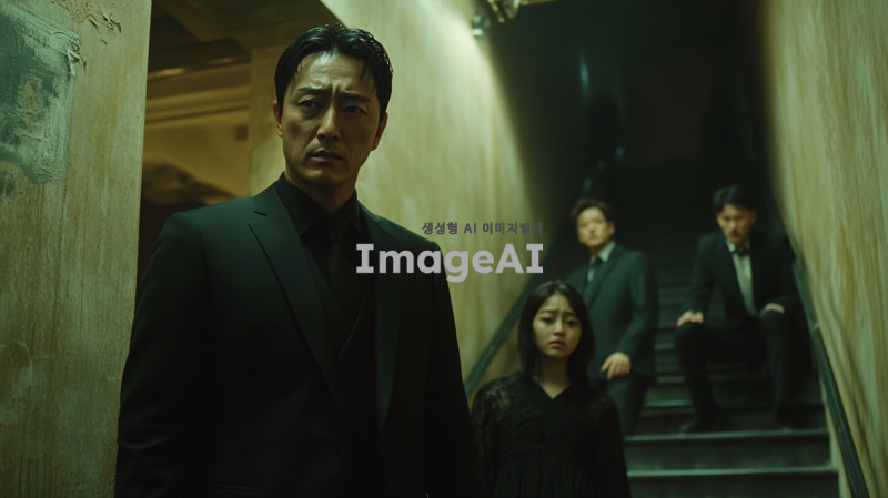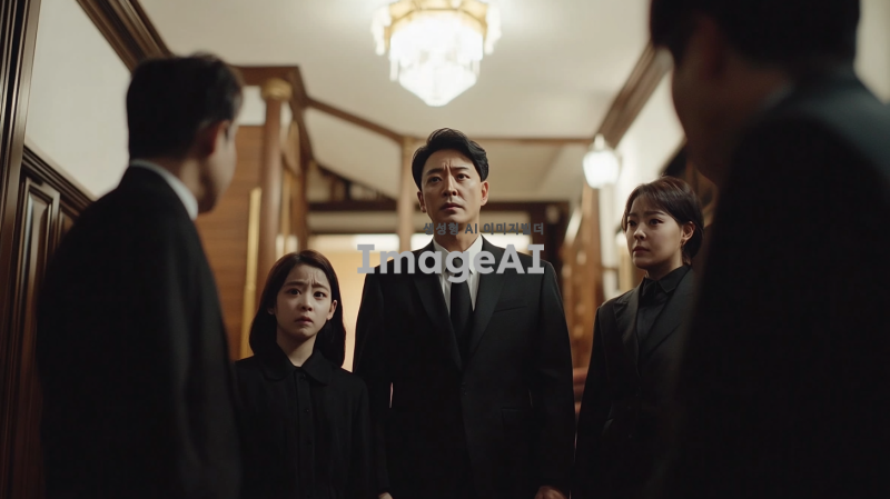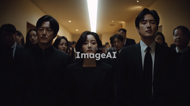 어두운 조명 아래 장례식장 내부, 검은 정장을 입은 사람들이 조용히 서성이고 있다. 윤성은 슬픔에 잠긴 얼굴로 주변을 둘러보고, 검은 드레스를 입은 다빈이 누군가를 찾고 있는 모습이 보인다. 윤성이 다빈에게 다가가려 하지만, 지훈의 부모님과 여동생이 그를 알아보고 슬픔과 분노가 섞인 표정을 짓는다. 부모님은 윤성에게 다가가며 가해자에 대한 분노를 드러낸다. 옆에는 지훈의 여동생이 눈물을 흘리며 서 있다. 복도 끝에는 계단에 앉아 멍하니 있는 민수가 보이며, 그의 얼굴에는 지훈의 죽음을 실감하는 듯한 쓸쓸함이 가득하다.