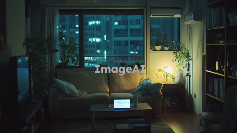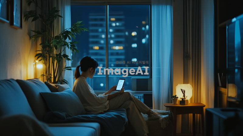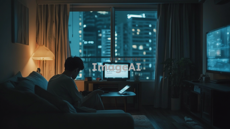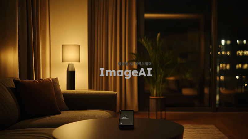 어두운 조명이 깔린 방 안, 현대적이고 깔끔한 인테리어의 아파트 내부. 방 한쪽에는 창문이 있어 약간의 외부 빛이 들어오고, 창문 밖으로는 도시의 야경이 보인다. 방 안에는 소파와 작은 테이블이 놓여 있고, 테이블 위에는 핸드폰이 놓여 있다. 핸드폰 화면에는 수상한 문자 메시지가 떠 있다. 방 안은 조용하고 긴장감이 감도는 분위기이며, 민수는 핸드폰을 주의 깊게 들여다보며 몰래 사진을 찍고 있다.