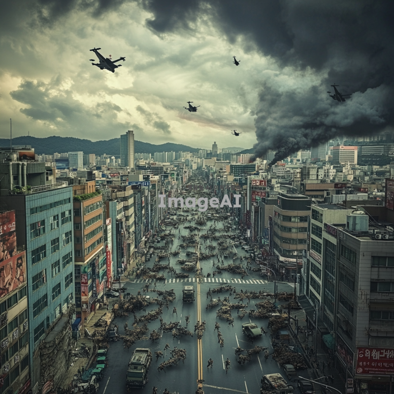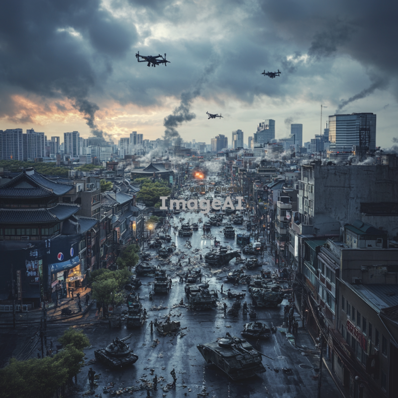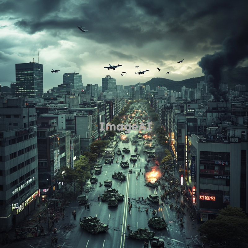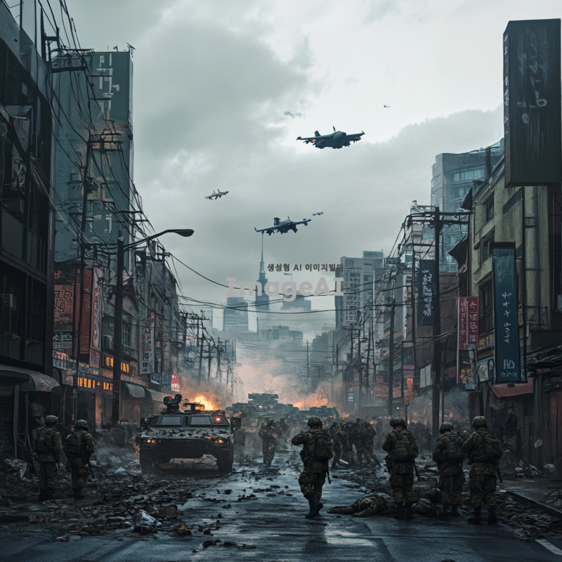대한민국 서울 시내, 긴장감이 감도는 어두운 하늘 아래, 군인들이 방어 준비를 하고 있는 모습. 거리에는 대피하는 시민들과 군용 차량들이 혼재되어 있으며, 군인들은 방어선을 구축하고 있다. 멀리서 들려오는 경고 사이렌 소리와 함께, 하늘에는 전투기가 비행하고 있다. 건물들은 전쟁의 긴박함을 반영하듯 약간의 손상이 보이며, 사람들은 서로를 돕고 있는 상황. 긴박한 분위기와 함께, 대한민국의 상징적인 건물들이 배경에 보인다.