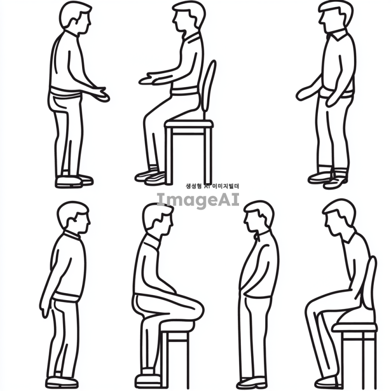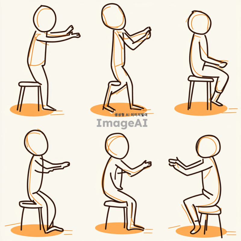 sit to stand(일어서기 과정), 졸라맨 그림 형식, 총 5단계로 1. 준비 단계: 시작 자세 설정, 2.전진 이동: 체중 중심 이동, 3.좌석 이탈: 엉덩이 들기, 4.상승 이동: 자세 확립, 5.안정 단계: 서 있는 상태 유지