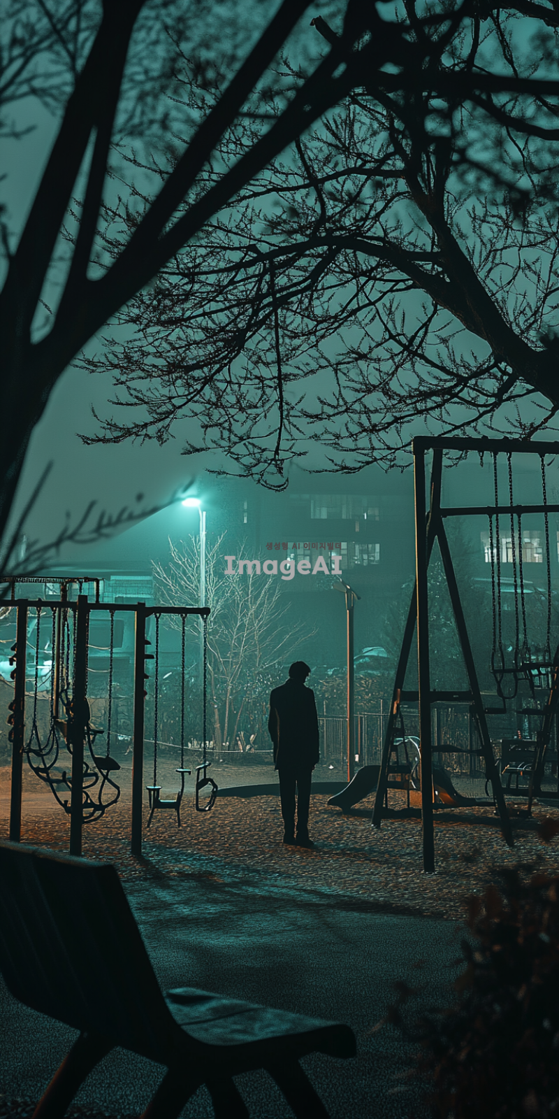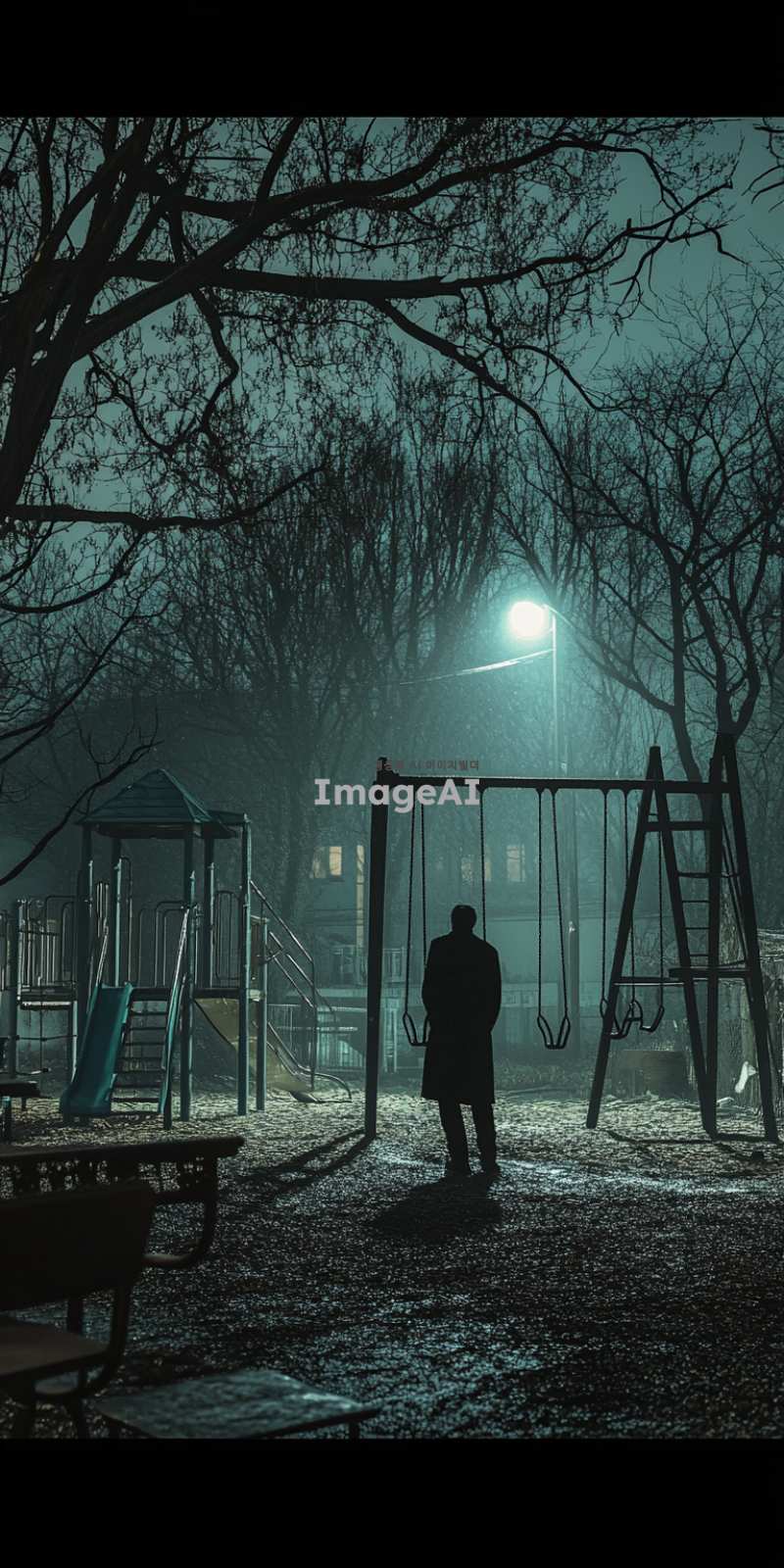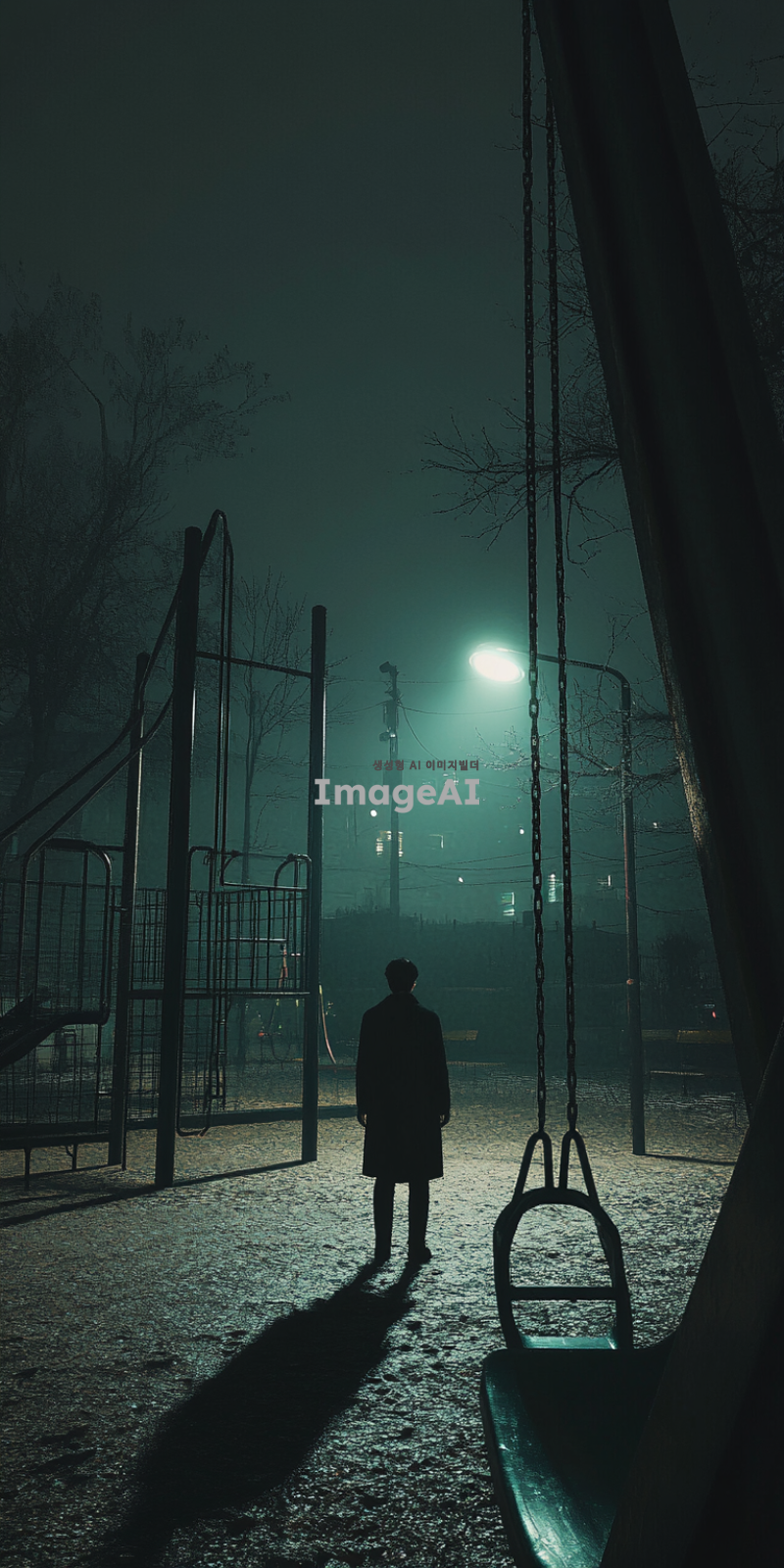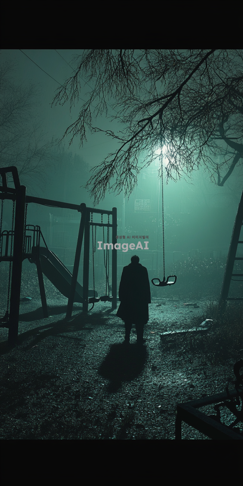 어둡고 음산한 분위기의 한국 놀이터, 흐릿한 조명 아래 그네와 미끄럼틀이 보이는 장면, 검은 옷을 입은 남자가 뒷모습으로 서 서 살인하며, 그의 주변에 미묘하게 불길한 기운이 감도는 모습, 남자의 그림자가 길게 늘어져 있으며, 주변 환경은 음산하고 기괴한 느낌을 주는 디테일로 묘사됨.
