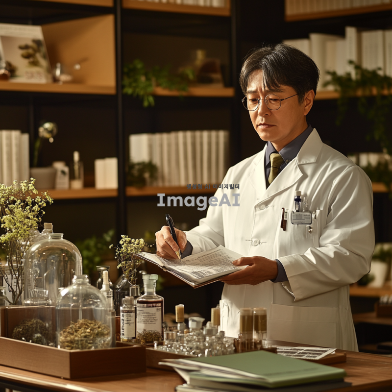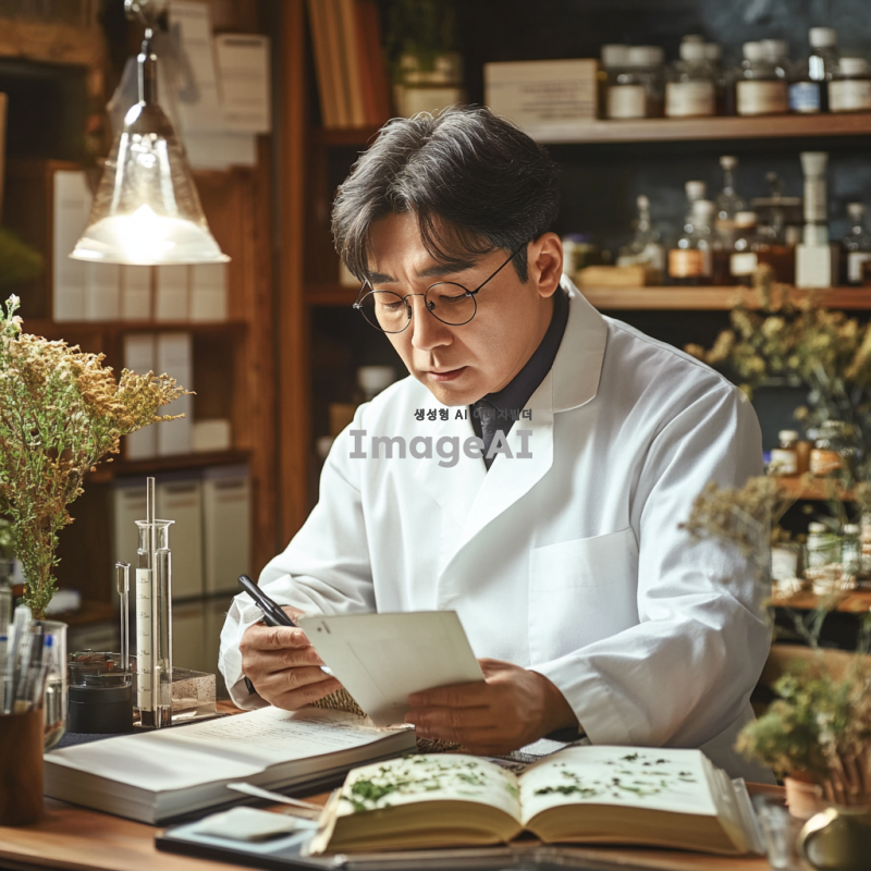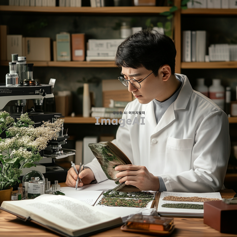 한국 전통 의학과 현대 과학이 조화를 이루는 간 건강 증진을 위한 이미지. 한의사가 전통 한약재를 연구하는 모습, 실험실에서 현대 과학 장비를 사용하는 장면. 자연 친화적인 색감과 따뜻한 조명, 건강한 간을 상징하는 녹색 톤을 활용. 전통과 현대가 조화를 이루는 느낌을 강조, 한의학 서적과 현대 과학 서적이 나란히 놓여 있는 책상.