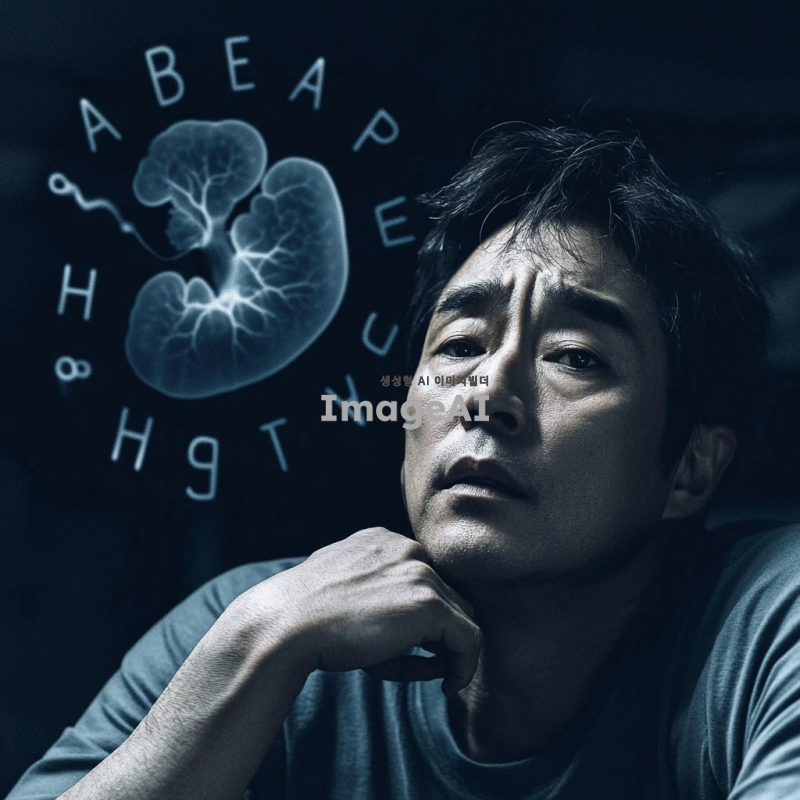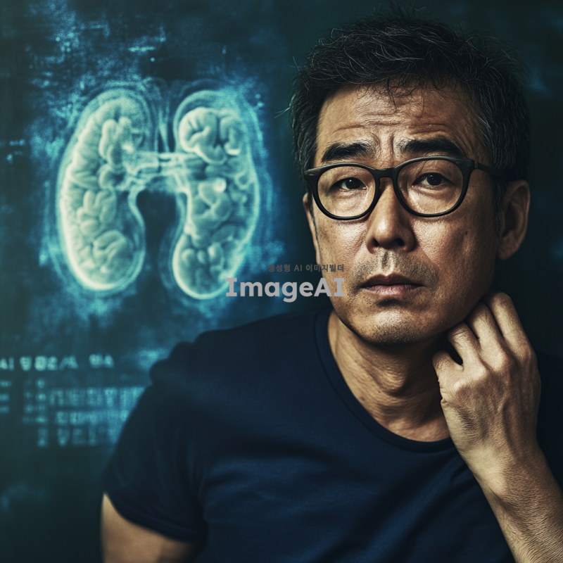 어두운 배경에 피로하고 지친 표정을 짓고 있는 중년 한국인 남성, 눈 밑에 다크서클이 짙고 피부가 창백한 모습, 오른손으로 오른쪽 옆구리를 가볍게 잡고 있는 자세, 배경에는 흐릿하게 간 모양의 그래픽이 겹쳐져 있는 이미지, 건강 문제를 암시하는 차분한 톤의 색감.