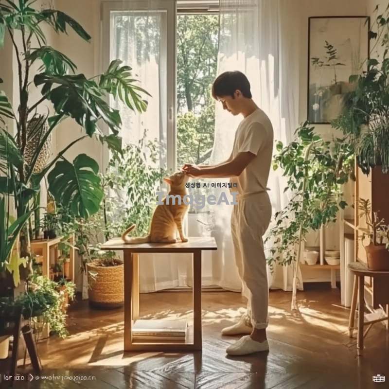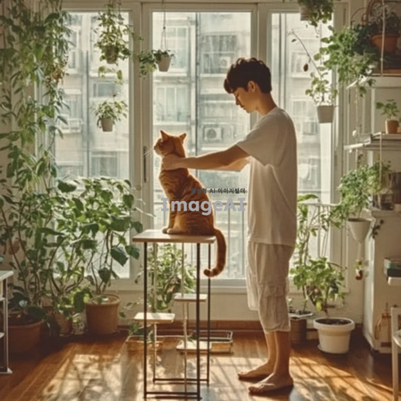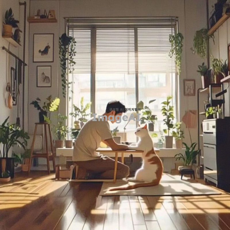 한국인 남성이 나무로 된 작은 탁자 위에 앉아 있는 고양이를 부드럽게 긁어주는 모습. 남성은 편안한 표정으로 고양이를 바라보고 있으며, 고양이는 만족스러운 표정으로 눈을 반쯤 감고 있다. 따뜻한 햇살이 창문을 통해 들어와 방 안을 밝게 비추고 있으며, 주변에는 식물이 놓여 있어 자연스러운 분위기를 연출하고 있다. 방은 아늑하고 평화로운 느낌을 주는 인테리어로 꾸며져 있다.