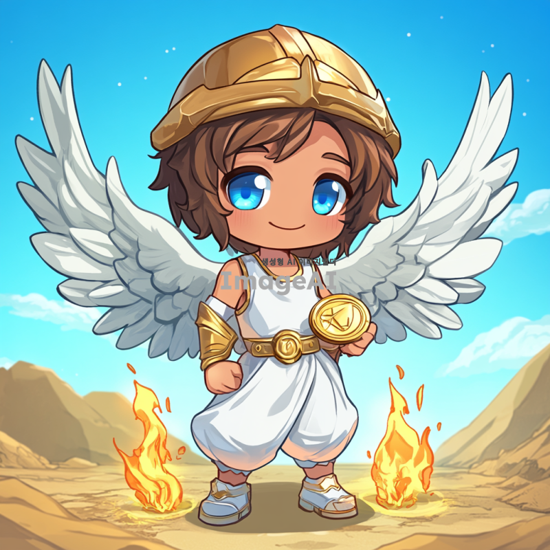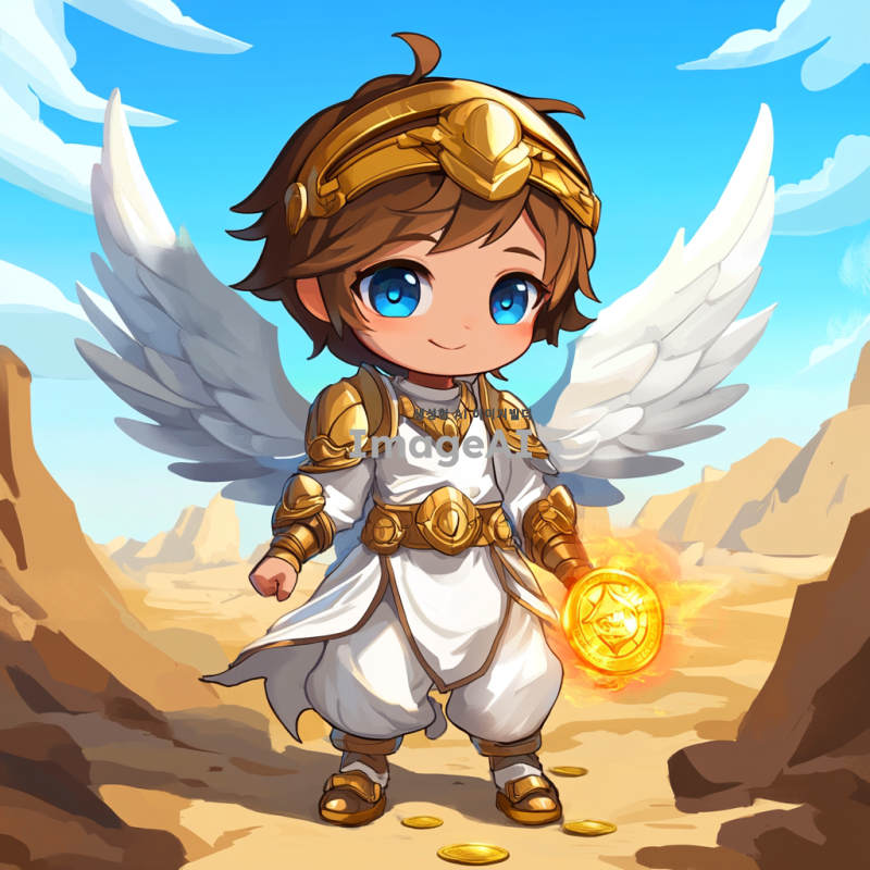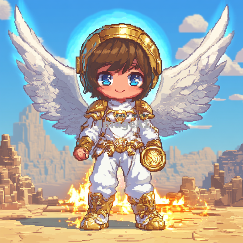 귀여운 하얀 옷을 입은 천사, 갈색 머리와 파란 눈을 가지고 있으며, 금색 헬멧과 날개를 착용하고 있다. 배경은 픽셀 아트 스타일의 사막 모래이다. 발 아래에는 두 개의 작은 빛나는 불꽃이 있으며, 웃고 있는 치비 얼굴을 가지고 있다. 이는 게임 캐릭터 아바타 프로필 사진으로, 단순한 디자인이다. 천사 앞에는 금화를 들고 있는 의인화된 소년이 서 있다. 매우 상세하며, 높은 해상도와 선명한 가장자리를 가지고 있다. 그림자나 그라데이션 색상은 없어야 한다.