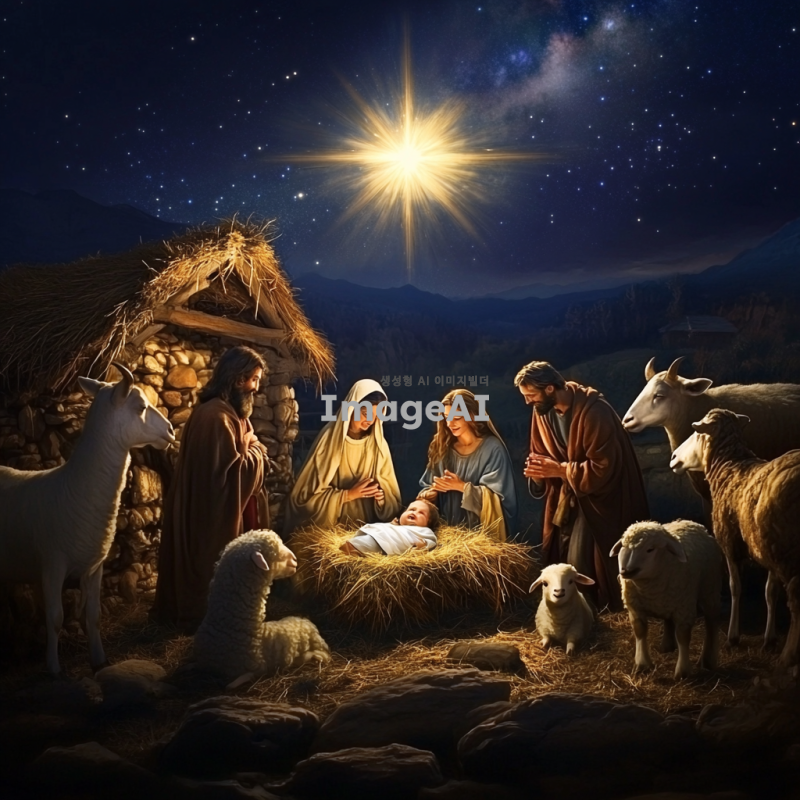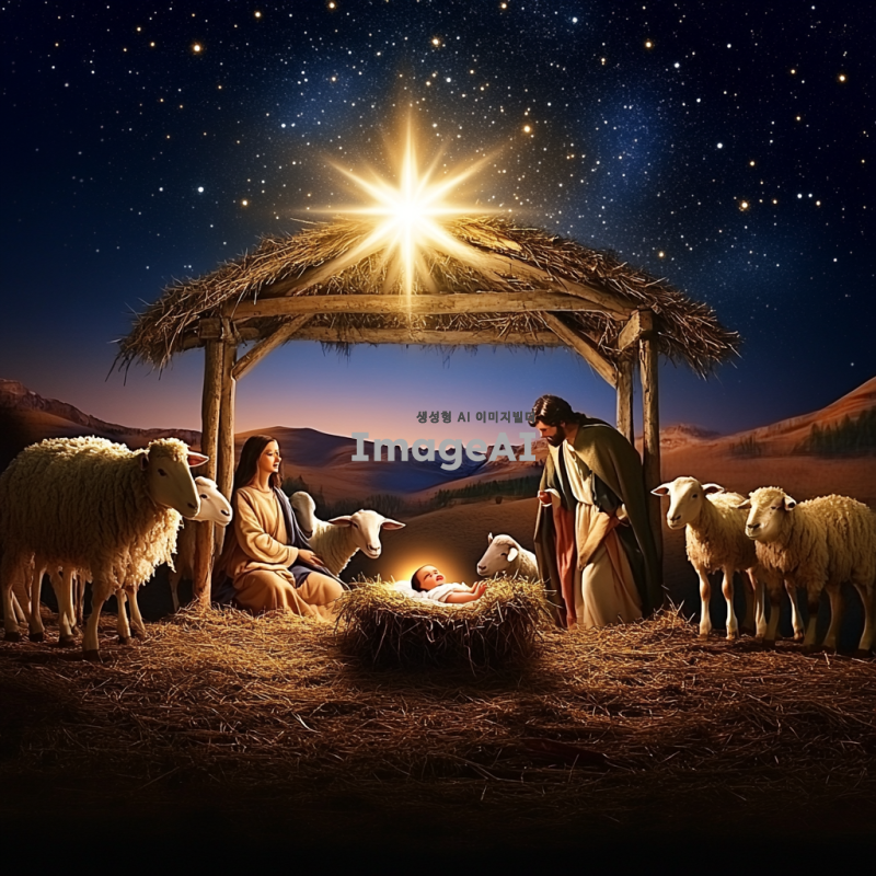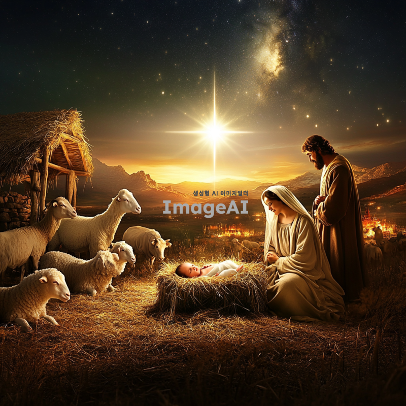 따뜻한 황금빛으로 물든 조용한 밤, 별이 빛나는 하늘 아래 평화로운 마구간 안, 구유에 누워 있는 아기 예수님, 주변에는 사랑스러운 미소를 짓고 있는 마리아와 요셉, 그리고 양과 소 같은 동물들이 함께 있는 장면. 배경에는 먼 곳에서 빛나는 크고 밝은 별, 아기 예수님을 비추는 부드러운 빛, 고요하고 경건한 분위기.