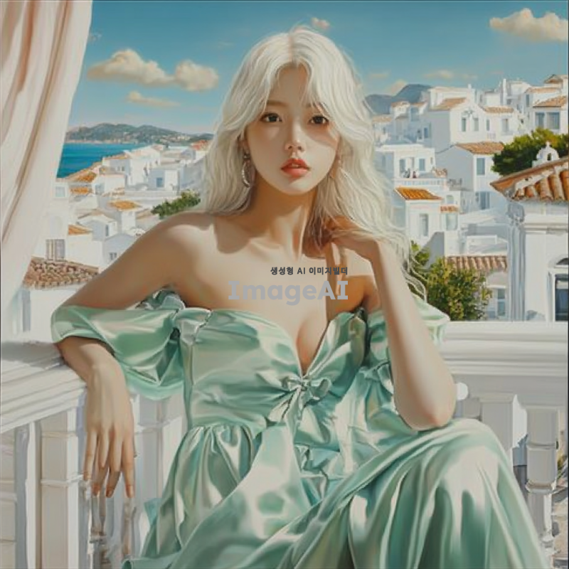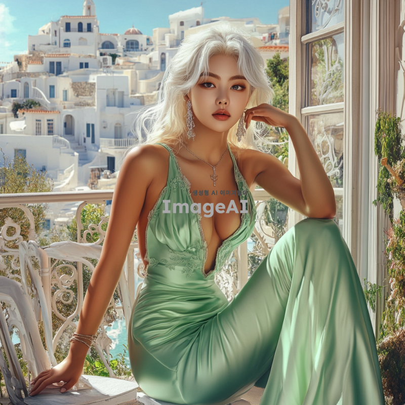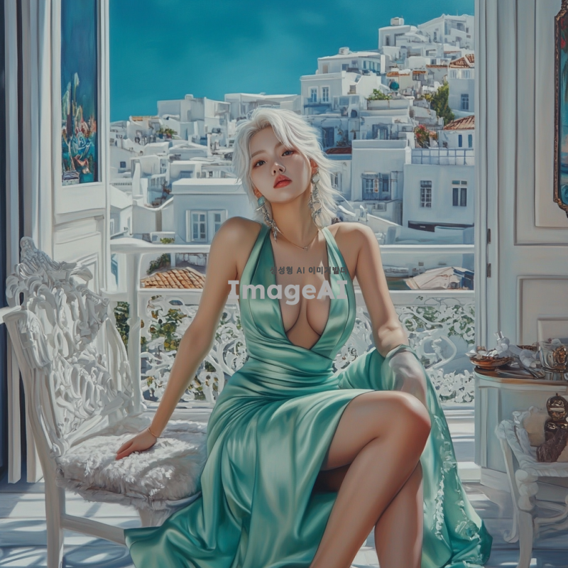 디지털 고도로 디테일한 그림의 걸작, 하얀 금발의 아름다운 한국 여성, 드레이프 바디 착용, 연두색 새틴의 머메이드 컷 드레스, 볼륨감 넘치는 모습, 높고 넓은 칼라가 어깨를 가로질러 무릎 길이로 부풀어 오름, 흰색 가구가 있는 발코니의 헴라인, 그리스식 좌식 공간, 배경에는 지중해의 흰색 주택이 있는 장면.