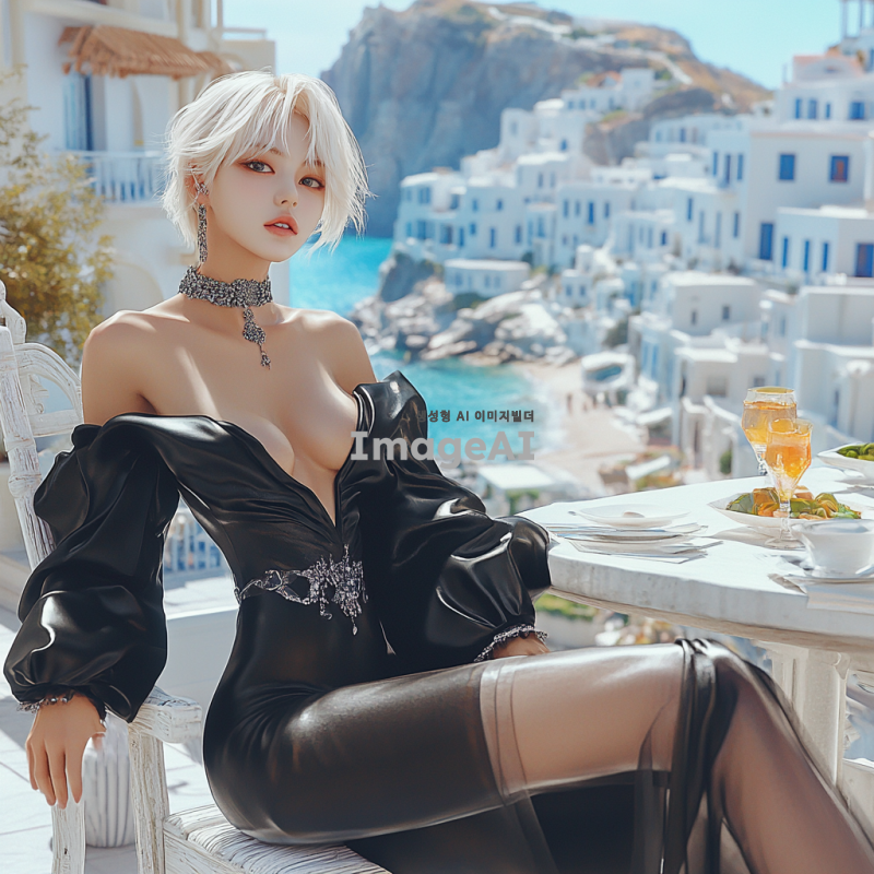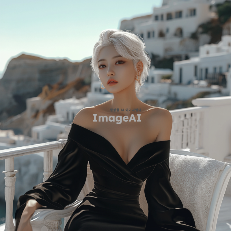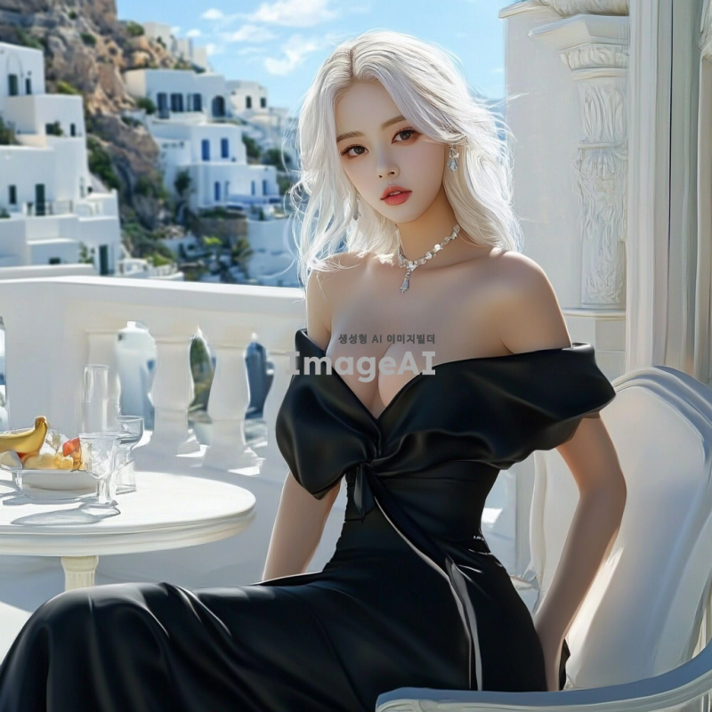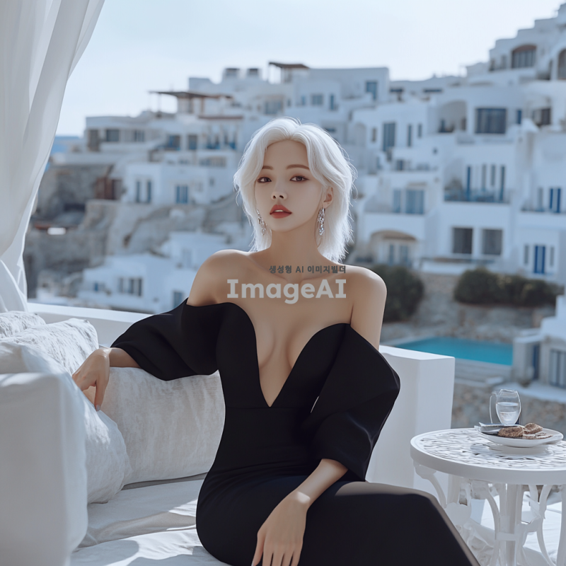 디지털 세밀화, 백금발의 아름다운 한국 여성, 드레이프된 바디, 인어 커트 가운, 연한 검정색 새틴 소재, 어깨를 가로지르는 볼륨감 있는 넓은 칼라, 무릎 길이에서 풍성해지는 실루엣, 발코니에 있는 그리스풍 휴식 공간, 흰색 가구, 배경에는 지중해의 흰색 집들.