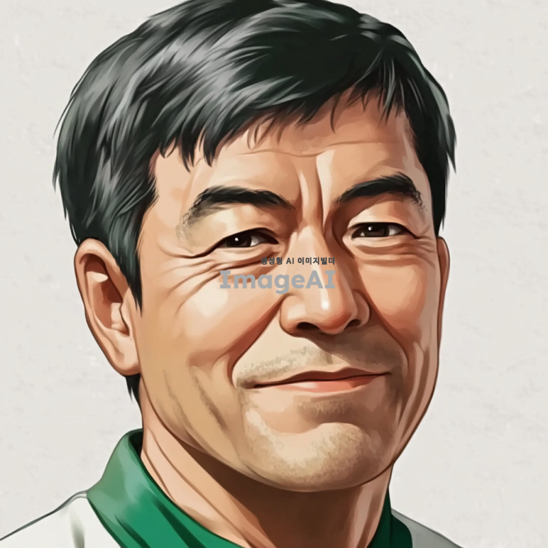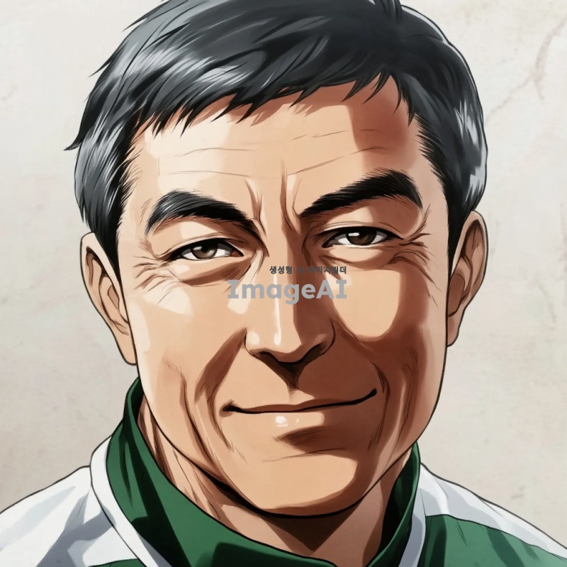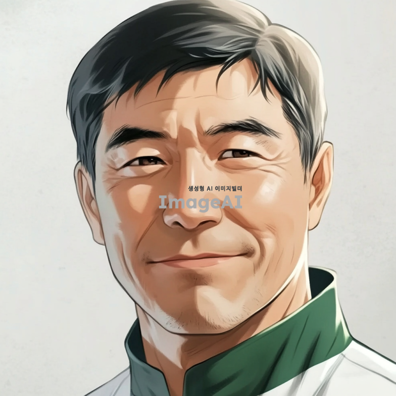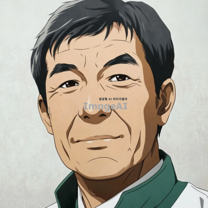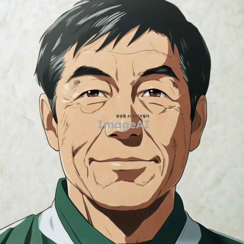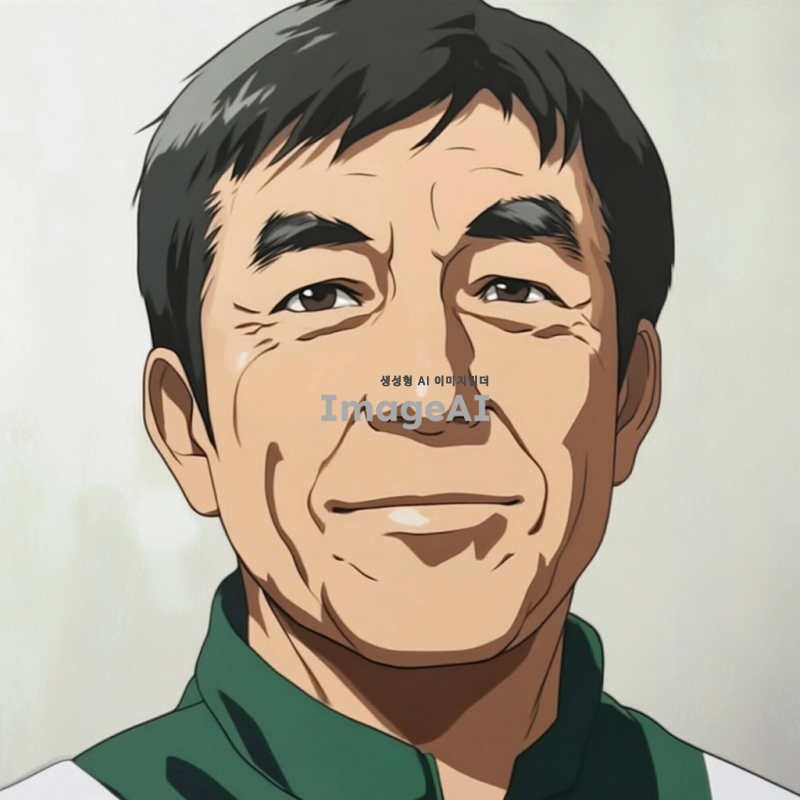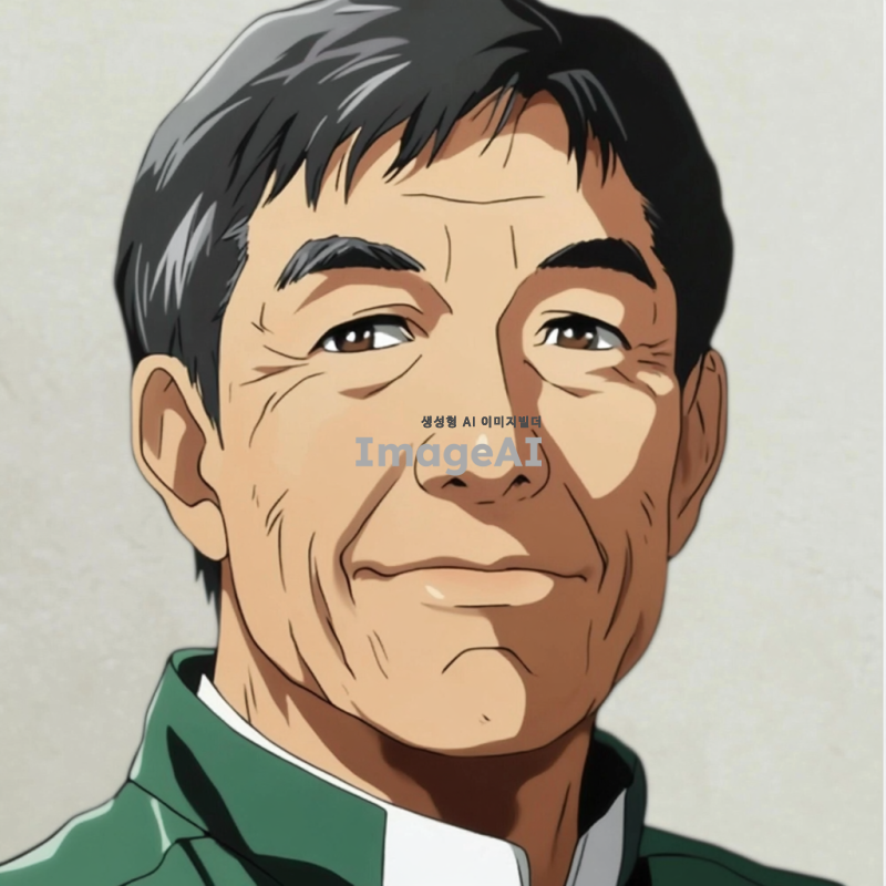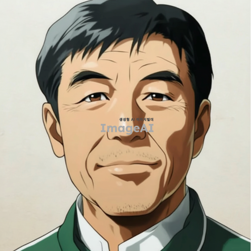 - 짧은 검은 머리를 가진 남자가 초록색과 흰색 옷을 입고 있는 애니메이션 스타일의 초상화. 그의 얼굴에는 주름이 있으며, 시청자를 향해 미소를 짓고 있는 60세 정도의 아시아인으로 묘사됨. 배경은 밝은 회색 톤. 클로즈업 샷.