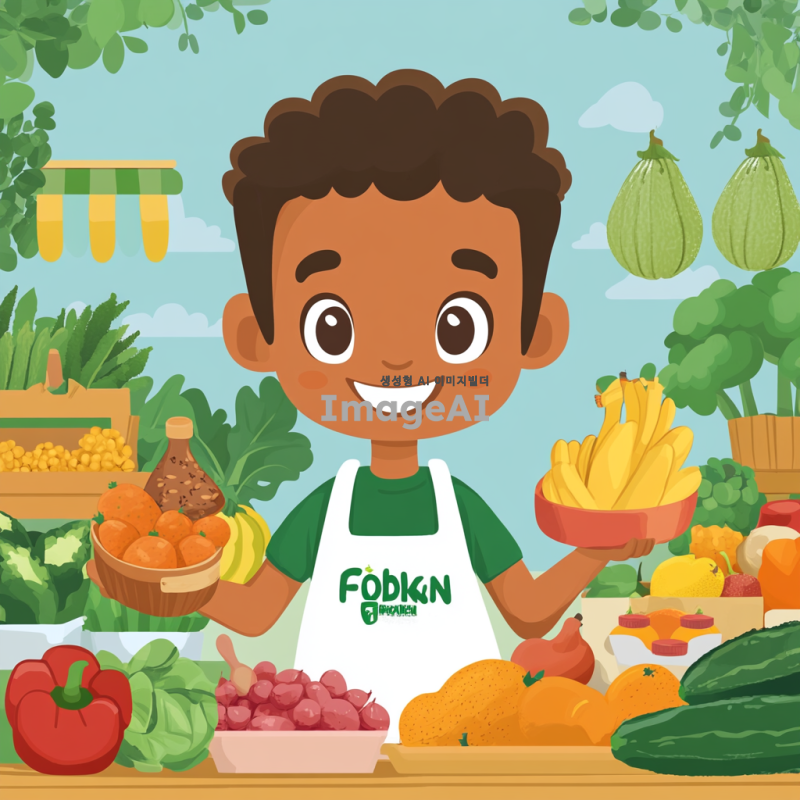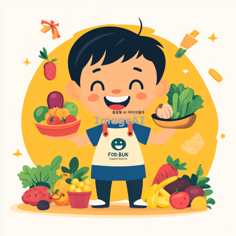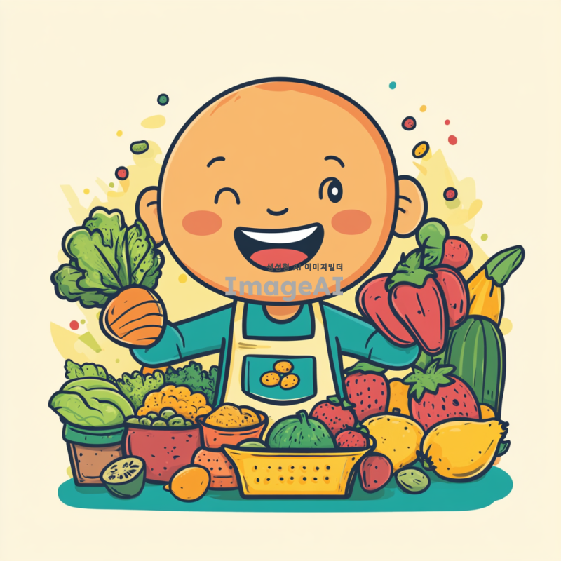 푸드뱅크를 상징하는 친근하고 귀여운 캐릭터, 밝은 미소를 지으며 다양한 음식을 들고 있는 모습, 푸드뱅크의 로고가 새겨진 앞치마를 입고 있으며, 주변에는 신선한 과일과 채소, 곡물이 가득한 장면, 따뜻하고 환영하는 분위기의 배경, 캐릭터는 건강하고 활기찬 느낌, 다양한 연령층에게 호감을 줄 수 있는 친근한 디자인.
