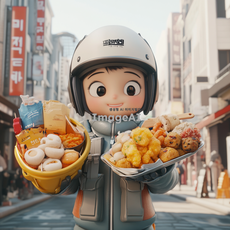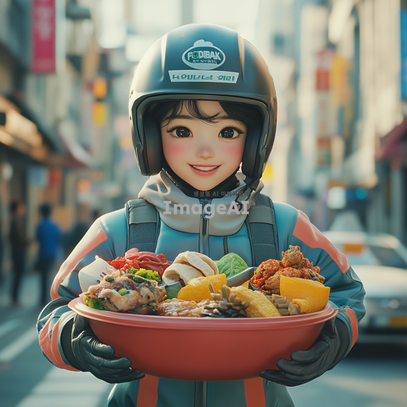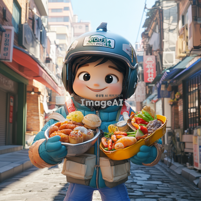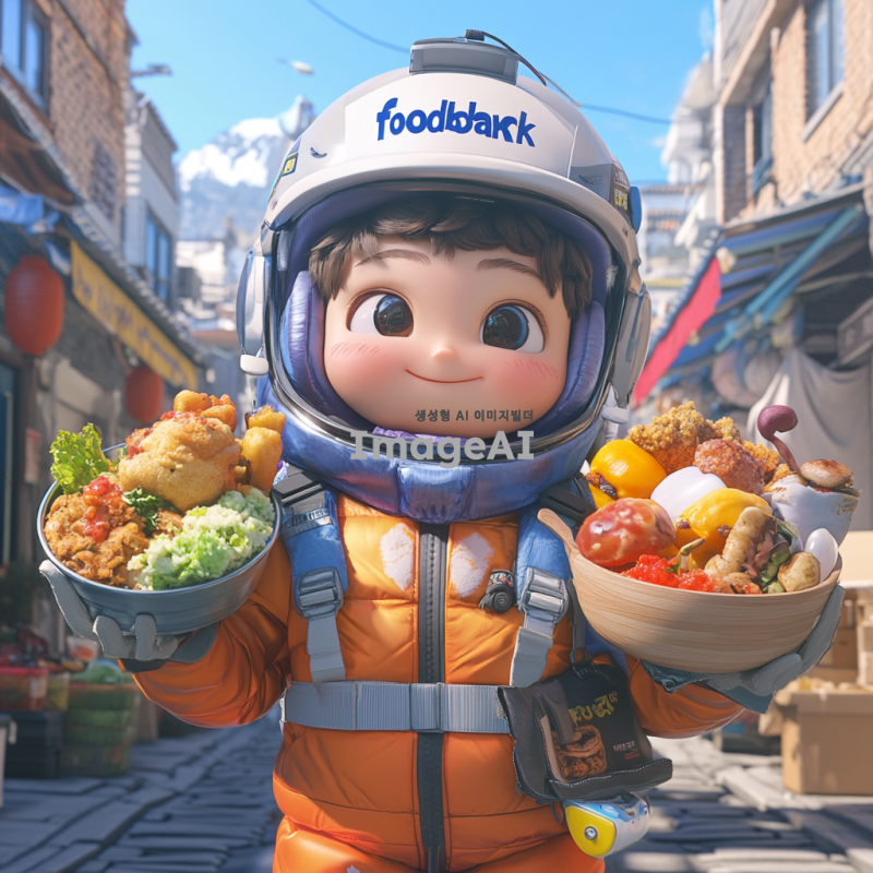 한국인의 모습을 한 캐릭터가 패딩을 입고 배달 헬멧을 착용한 채 다양한 음식을 들고 있는 장면. 캐릭터의 헬멧에는 Foodbank 로고가 선명하게 보이며, 배경은 도시의 거리로 설정하여 배달의 역동성을 강조. 음식은 한국의 다양한 전통 음식들로 구성되어 있으며, 캐릭터의 표정은 친절하고 활기차게 표현.