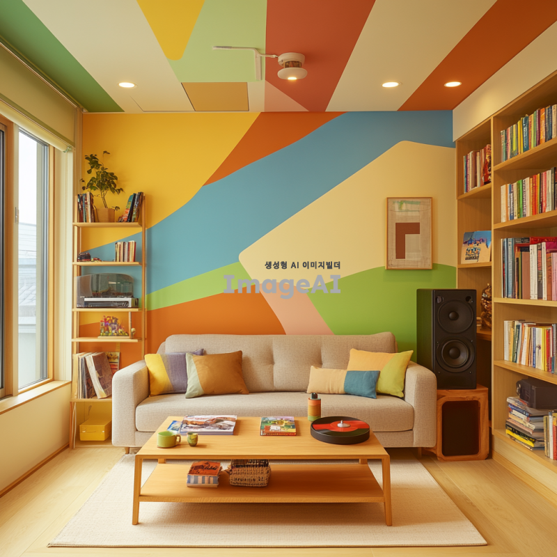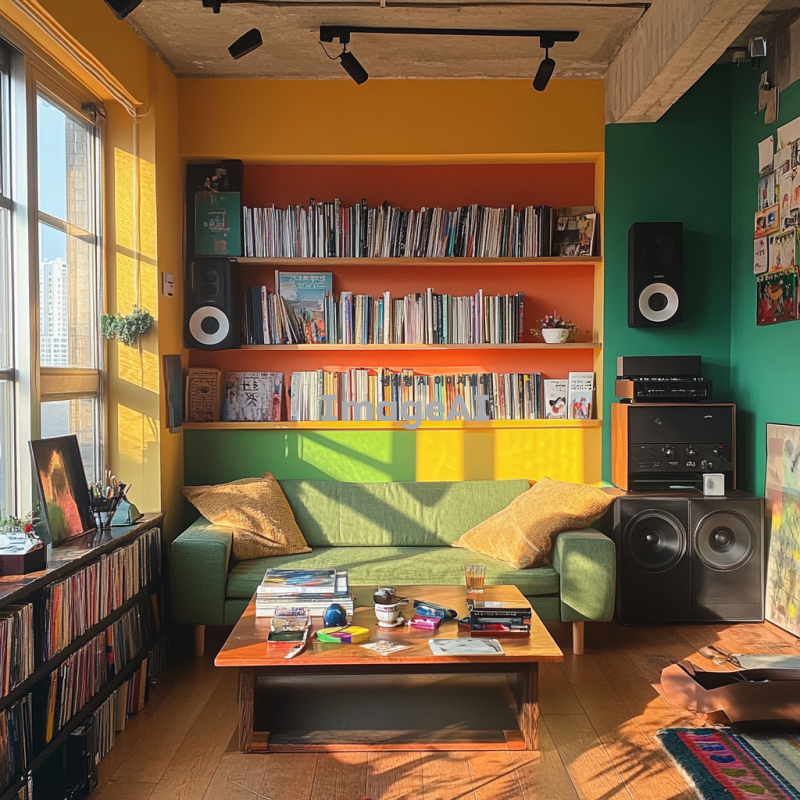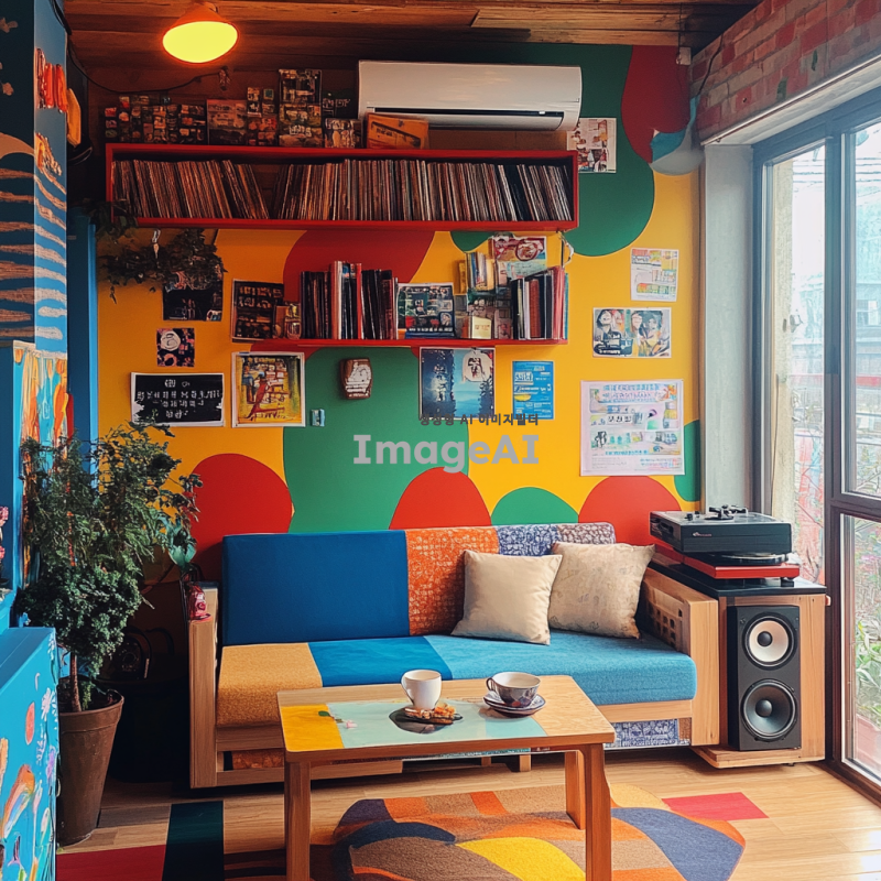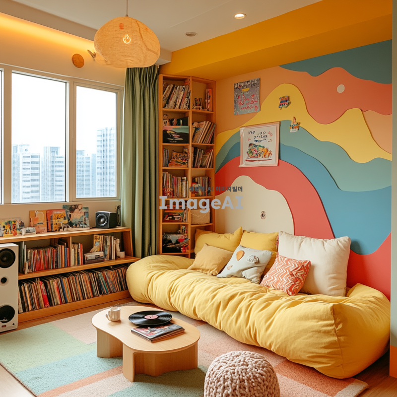 밝고 화려한 색감의 청구를 배경으로 한 스무 살의 한국인이 취미를 즐기는 방. 벽은 다양한 색상의 페인트로 칠해져 있으며, 방 안에는 아늑한 소파와 책장이 놓여 있다. 책장에는 다양한 취미 관련 책들이 꽂혀 있고, 소파 옆에는 커피 테이블이 놓여 있다. 테이블 위에는 차와 간단한 간식이 놓여 있으며, 방 한쪽에는 음악을 들을 수 있는 스피커와 레코드 플레이어가 있다. 천장에는 따뜻한 조명을 설치하여 방 전체에 포근한 분위기를 더한다. 창문을 통해 들어오는 자연광이 방 안을 환하게 비추고 있다.