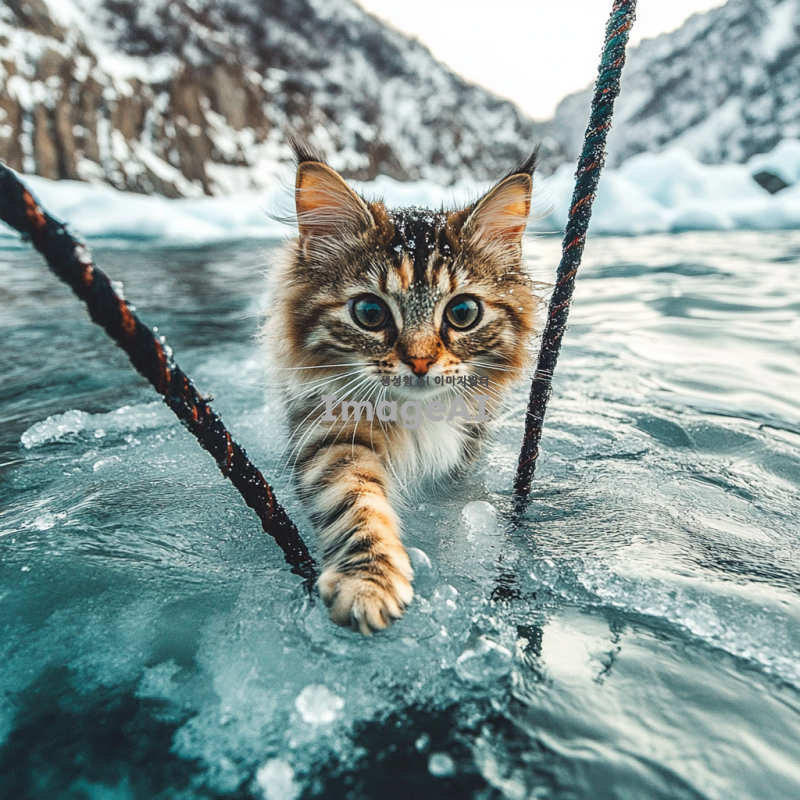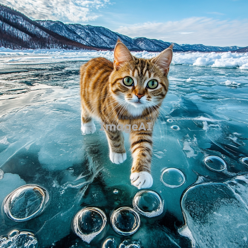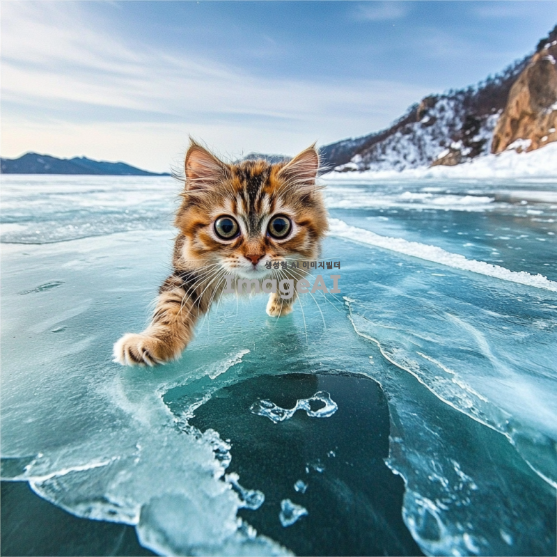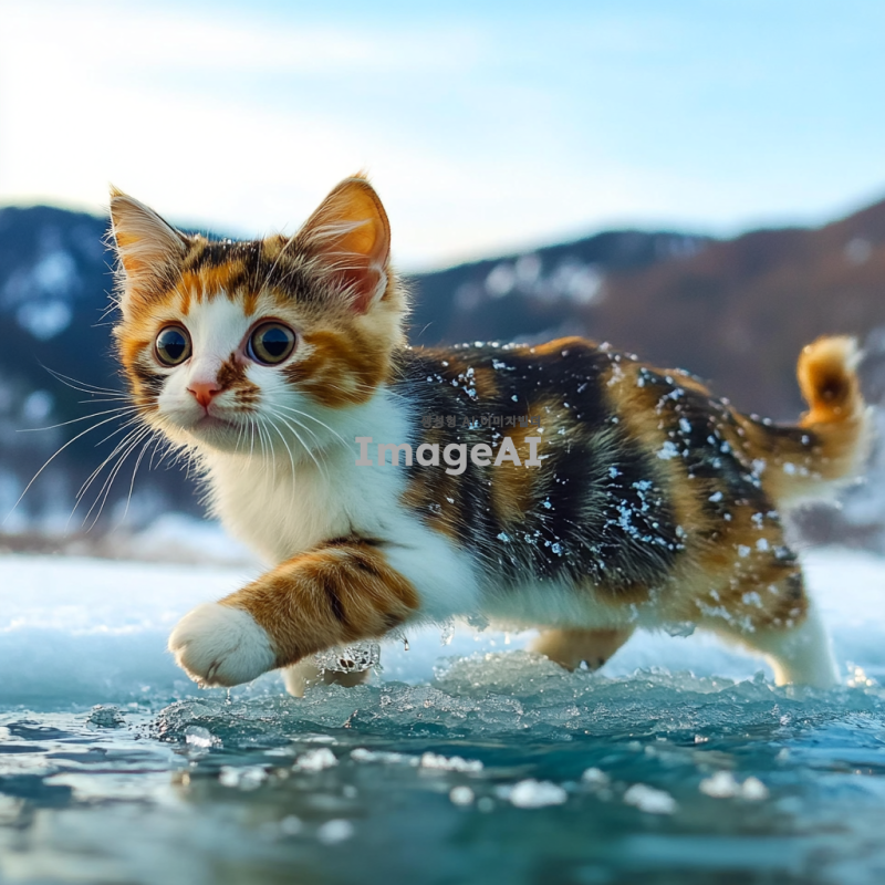 겨울의 차가운 바람이 부는 날, 투명한 얼음 호수 위를 걸어가는 귀여운 한국 고양이. 고양이의 발밑에는 얼음 속에 갇힌 작은 기포들이 보이며, 주변에는 하얀 눈이 소복이 쌓여 있다. 고양이는 털이 복슬복슬하고, 호기심 가득한 눈으로 주변을 살피고 있다. 배경은 푸른 하늘과 희미하게 보이는 산들로 둘러싸여 있으며, 차가운 공기가 느껴지는 장면.