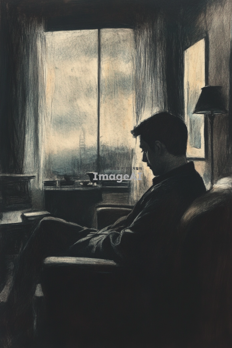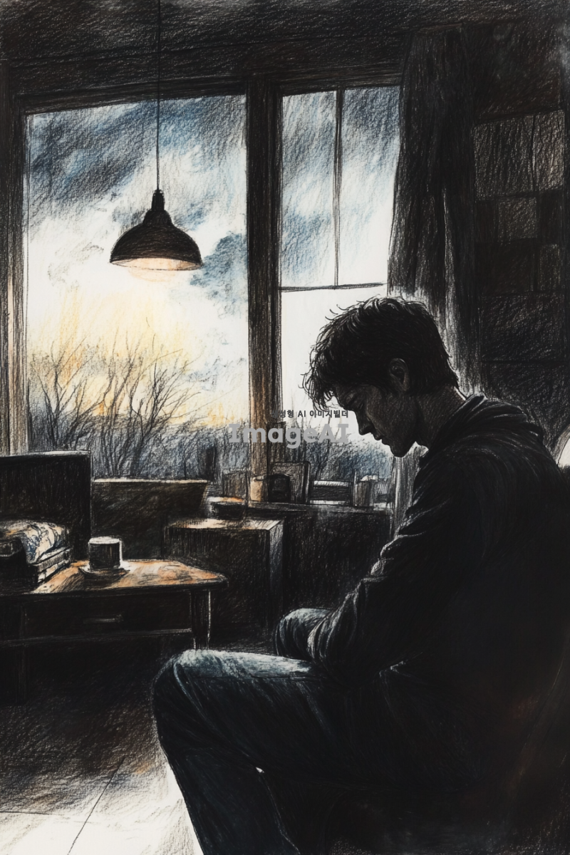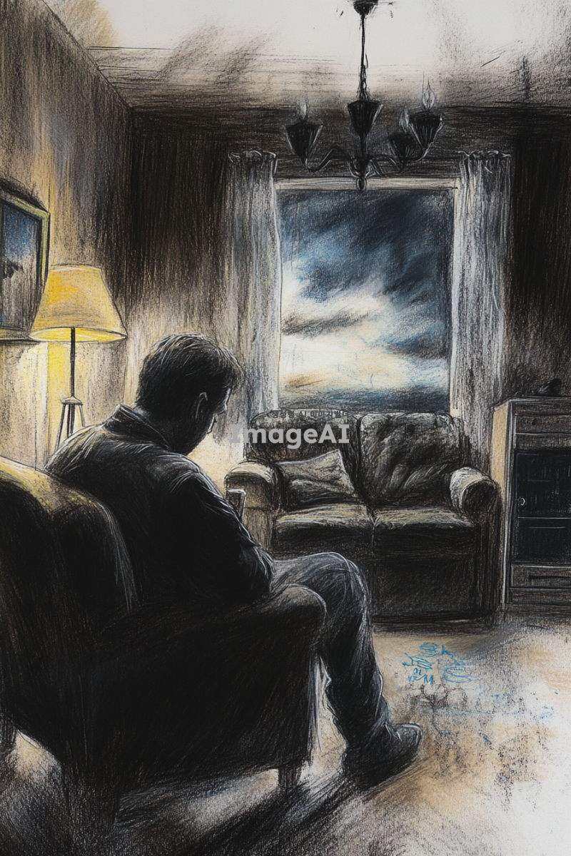 어두운 조명 아래, 집 안의 거실에 홀로 앉아 슬퍼하는 남자. 남자의 표정은 깊은 슬픔과 고독을 표현하고 있으며, 주변은 검은색 계열의 연필과 색연필로 그려진 그림자와 어두운 색조로 가득 차 있다. 방 안의 가구와 소품들도 동일한 색조로 묘사되어 있으며, 창문 밖으로는 흐린 하늘이 보인다. 전체적으로 차분하고 우울한 분위기를 강조하는 장면.