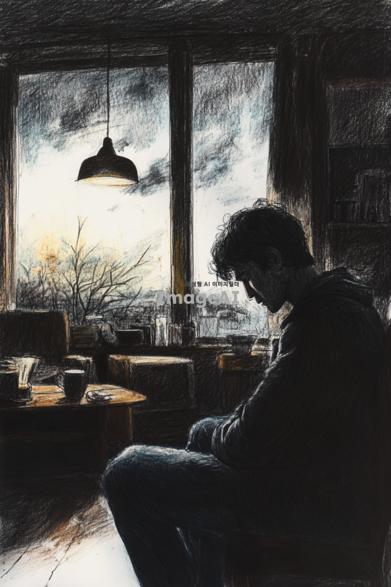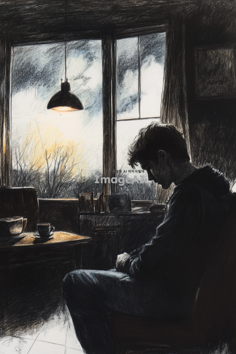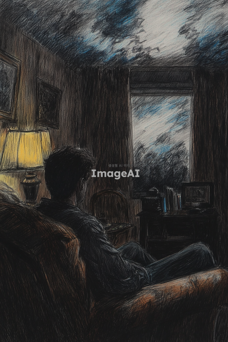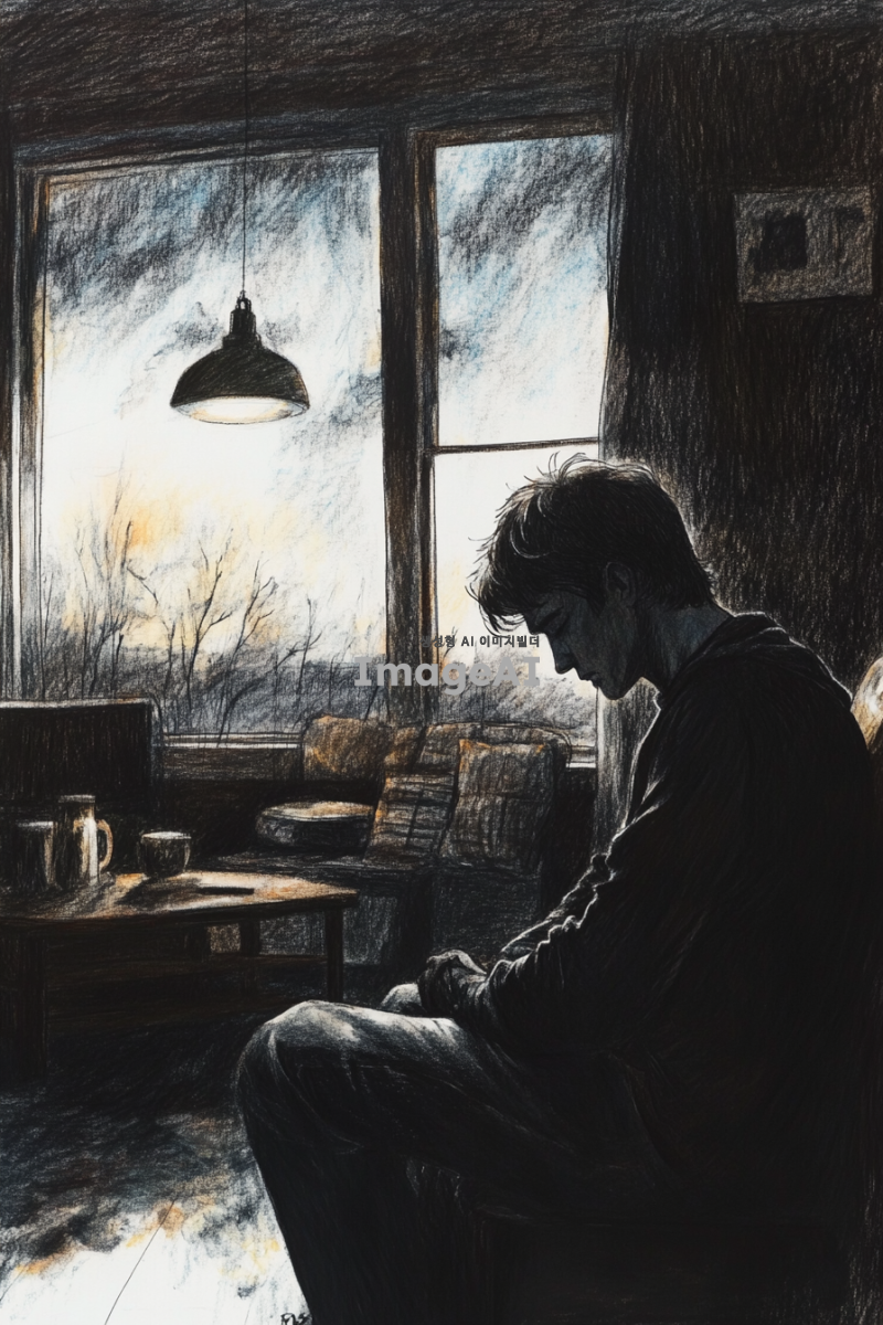 어두운 조명 아래, 집 안의 거실에 홀로 앉아 슬퍼하는 남자. 남자의 표정은 깊은 슬픔과 고독을 표현하고 있으며, 주변은 검은색 계열의 연필과 색연필로 그려진 그림자와 어두운 색조로 가득 차 있다. 방 안의 가구와 소품들도 동일한 색조로 묘사되어 있으며, 창문 밖으로는 흐린 하늘이 보인다. 전체적으로 차분하고 우울한 분위기를 강조하는 장면.