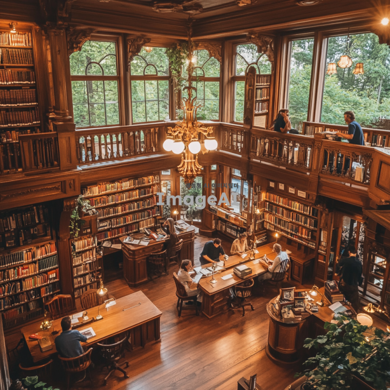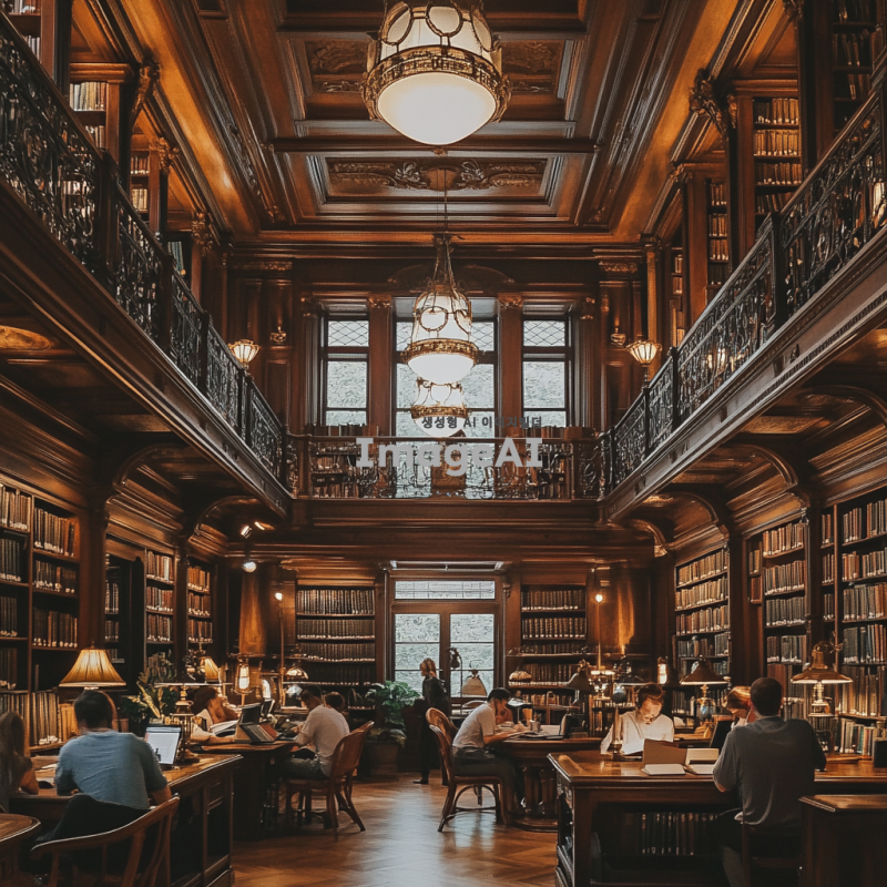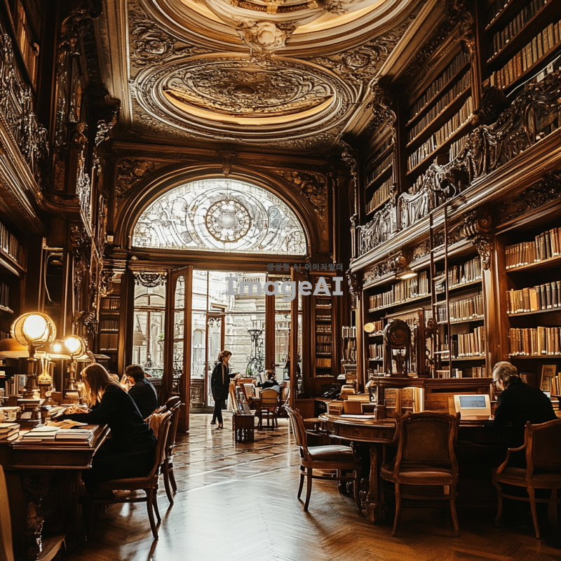 고풍스러운 도서관 내부, 높은 천장과 웅장한 나무 책장, 고전적인 디자인의 책상과 의자, 따뜻한 조명 아래에서 책을 읽는 사람들, 곳곳에 빈티지한 장식품과 오래된 책들이 가득한 모습, 창문을 통해 들어오는 자연광이 고풍스러운 분위기를 더함, 조용하고 평화로운 분위기.