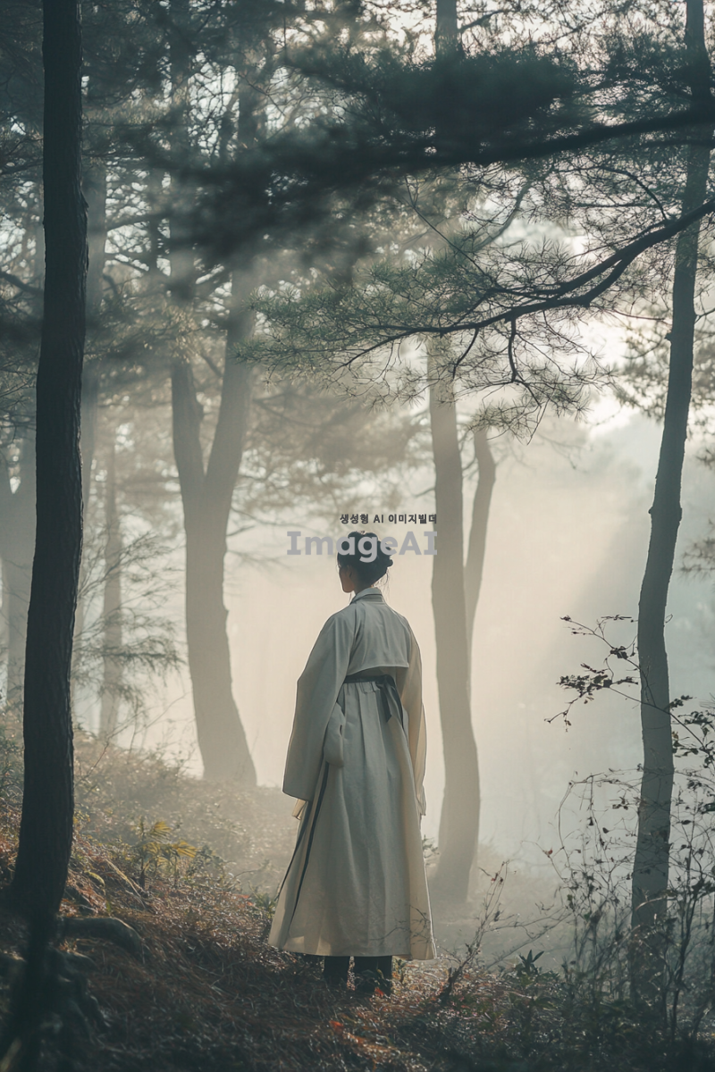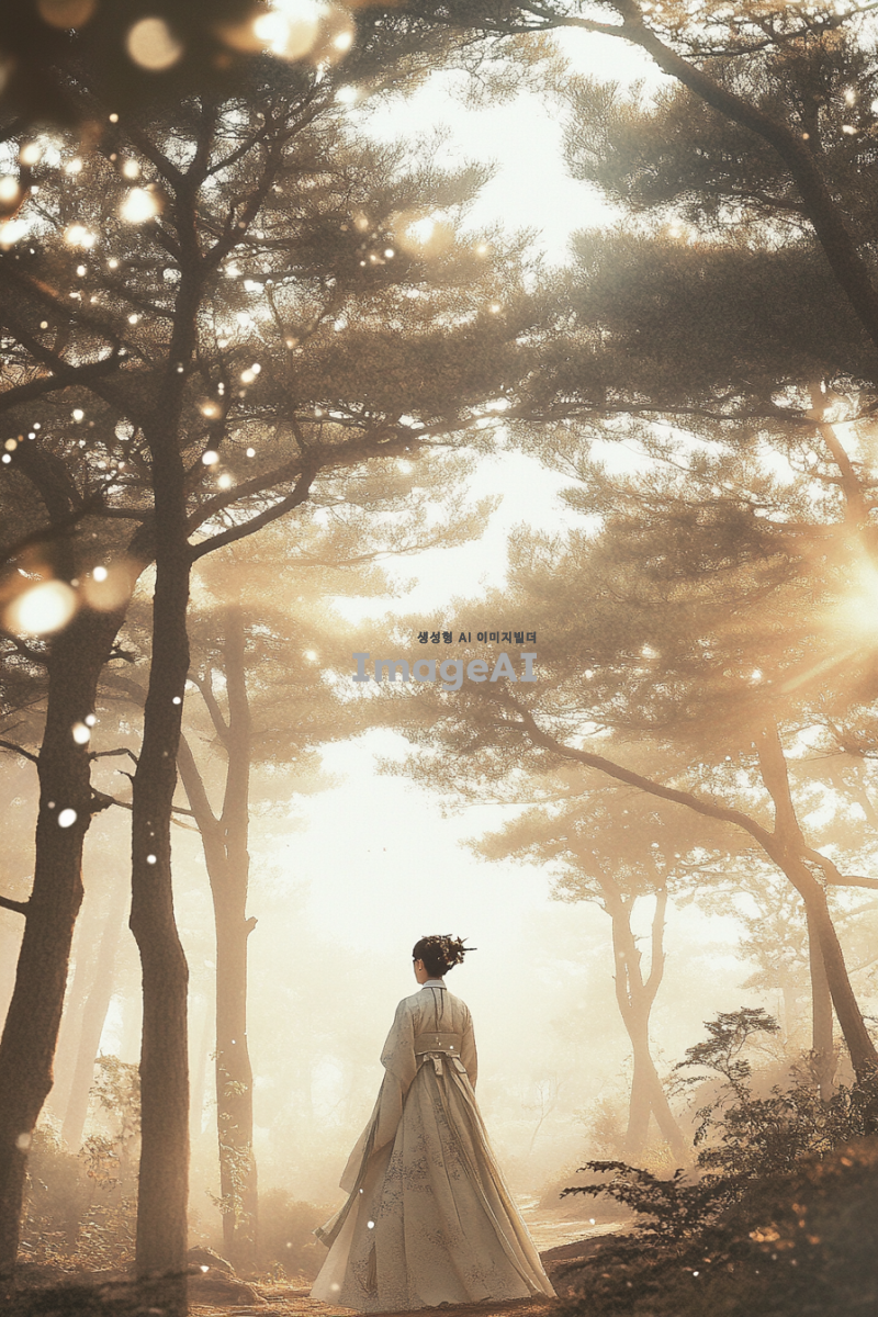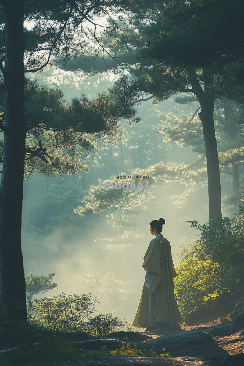 신비로운 숲속의 소나무가 사람처럼 의인화되어 서 있는 장면. 한국의 전통적인 복식이 현대적으로 재해석된 옷을 입고있다. 나무들은 곧고 우아하게 뻗어 있으며, 주변에는 안개가 살짝 깔려 있어 신비로운 분위기를 더하며, 부드러운 햇살이 나무 사이로 스며들어 따뜻한 느낌을 줌. 전체적으로 한국 전통 미술에서 영감을 받은 색감과 구도를 사용하여 자연의 경이로움을 강조함.