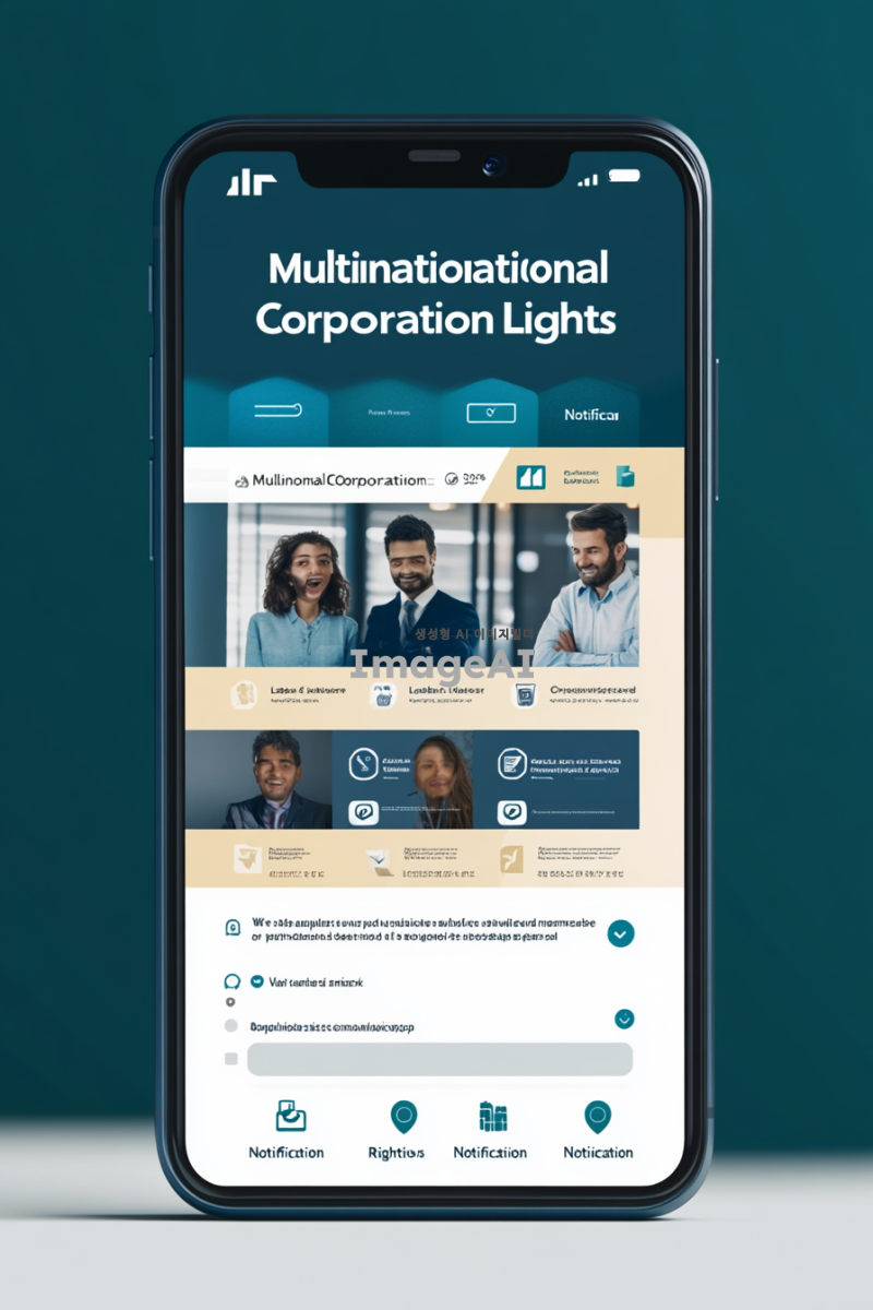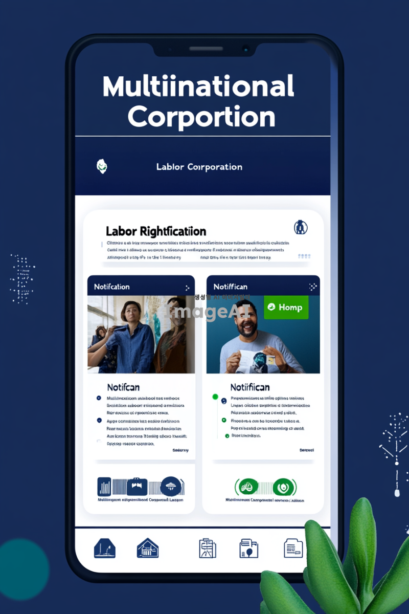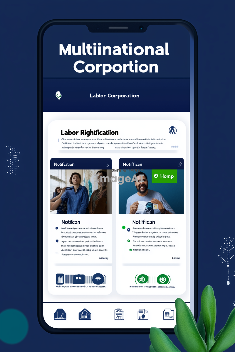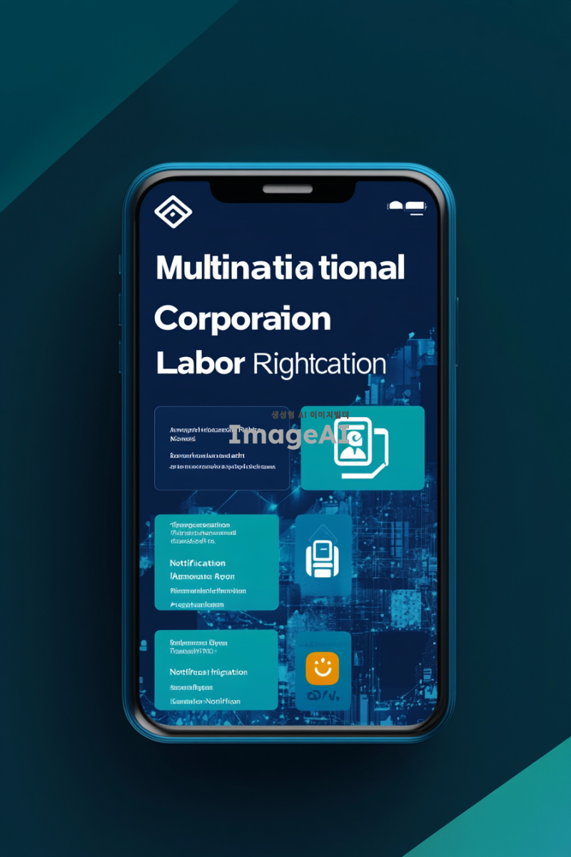 다국적기업 노동 인권을 알리는 앱의 메인 화면 디자인. 화면의 상단에는 앱 로고와 함께 "다국적기업 노동 인권 알림"이라는 제목이 중앙에 배치되어 있다. 화면의 왼쪽에는 카드뉴스 섹션이 있으며, 카드 형식으로 다국적 기업의 노동 인권 관련 뉴스와 정보를 제공하는 이미지가 있다. 각 카드에는 기업 로고와 함께 간략한 텍스트가 포함되어 있어 사용자들이 쉽게 정보를 파악할 수 있다. 오른쪽에는 로드맵 섹션이 있으며, 기업들이 인증마크를 제품에 부착했는지 여부를 시각적으로 보여주는 로드맵 이미지가 있다. 로드맵은 타임라인 형식으로 되어 있으며, 각 기업의 인증마크 상태를 색상으로 구분하여 한눈에 알아볼 수 있도록 디자인되어 있다. 화면 하단에는 사용자 인터페이스를 위한 내비게이션 바가 있으며, '홈', '카드뉴스', '로드맵', '설정' 등의 메뉴가 아이콘과 함께 배치되어 있다. 전체적인 색상은 신뢰감을 주는 블루와 그린 계열로 구성되어 있으며, 직관적이고 깔끔한 디자인을 유지하고 있다.