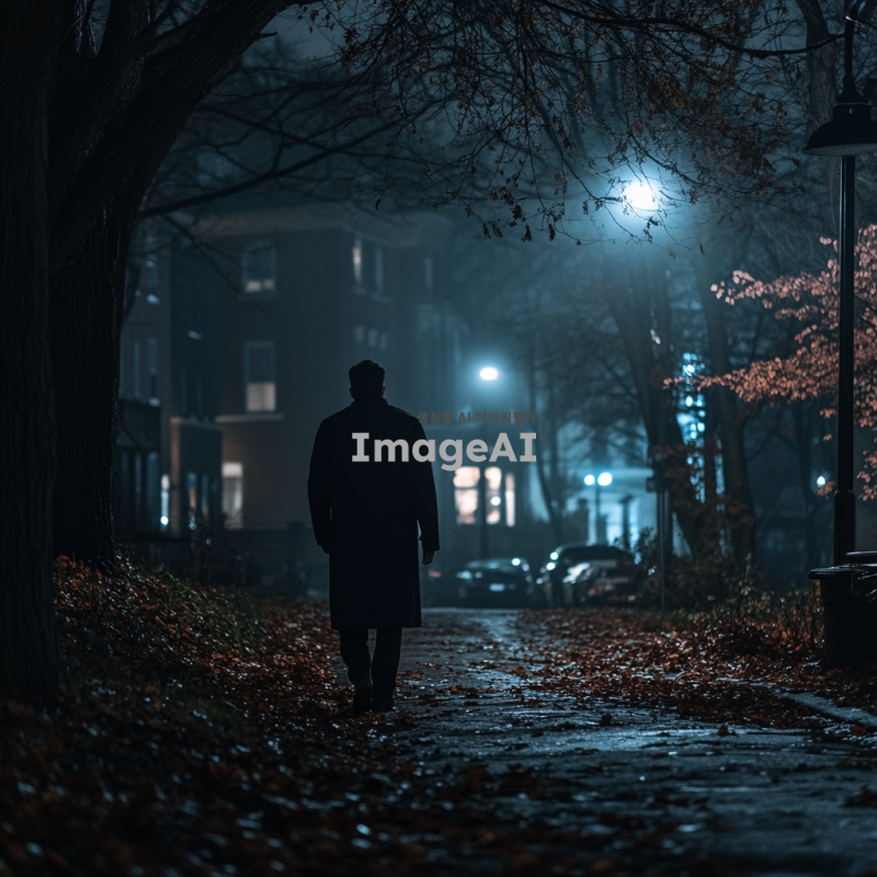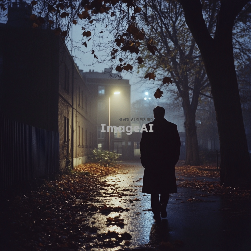 어두운 저녁, 거리의 희미한 가로등 불빛 아래 한 남자가 경찰서로 걸어가는 뒷모습. 남자는 어두운 색의 코트를 입고 있으며, 주변은 정적이 감도는 무거운 분위기. 길가에는 낙엽이 흩어져 있고, 멀리 경찰서의 불빛이 희미하게 보인다. 남자의 발걸음은 느리고 신중해 보이며, 주변의 건물들은 그림자 속에 가려져 있다.