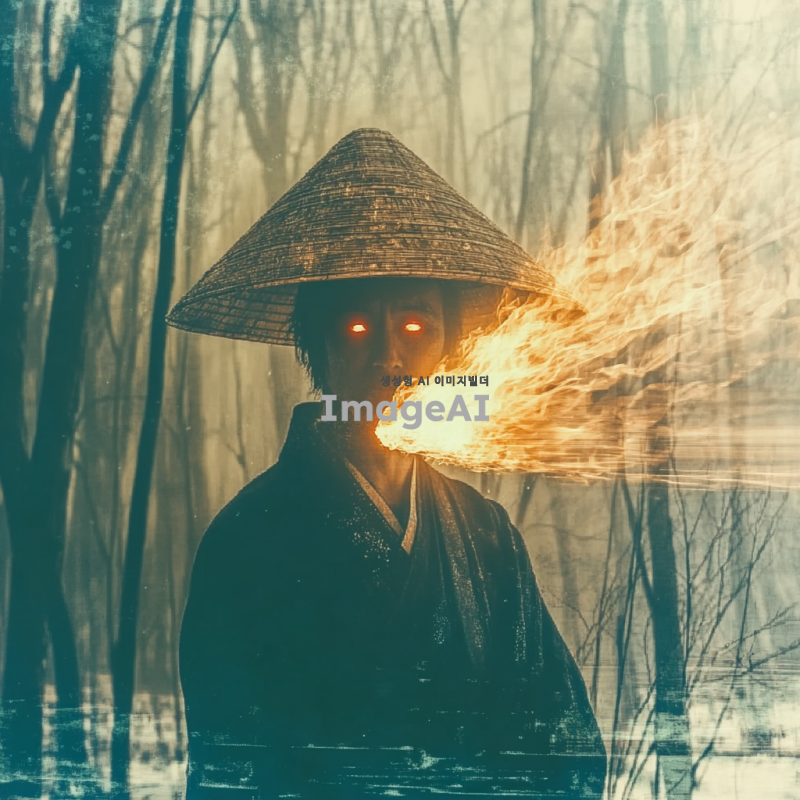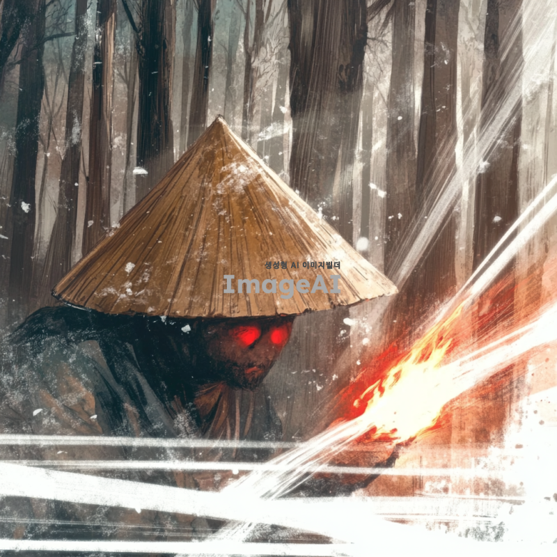 삿갓을 쓴 얼굴이 보이지 않는 남자가 불을 다루고 있는 장면, 주변은 차가운 기운이 감도는 겨울 풍경, 얼음과 눈이 쌓인 배경, 남자의 손에서 불꽃이 피어오르고 있으며, 불꽃은 따뜻한 색조로 빛나고 주변의 차가운 색조와 대조를 이루고 있음, 삿갓은 전통적인 디자인으로 묘사, 남자의 의상은 어두운 색조로, 불빛에 의해 부분적으로 강조된 모습, 한쪽눈이 붉게 빛나고 있다